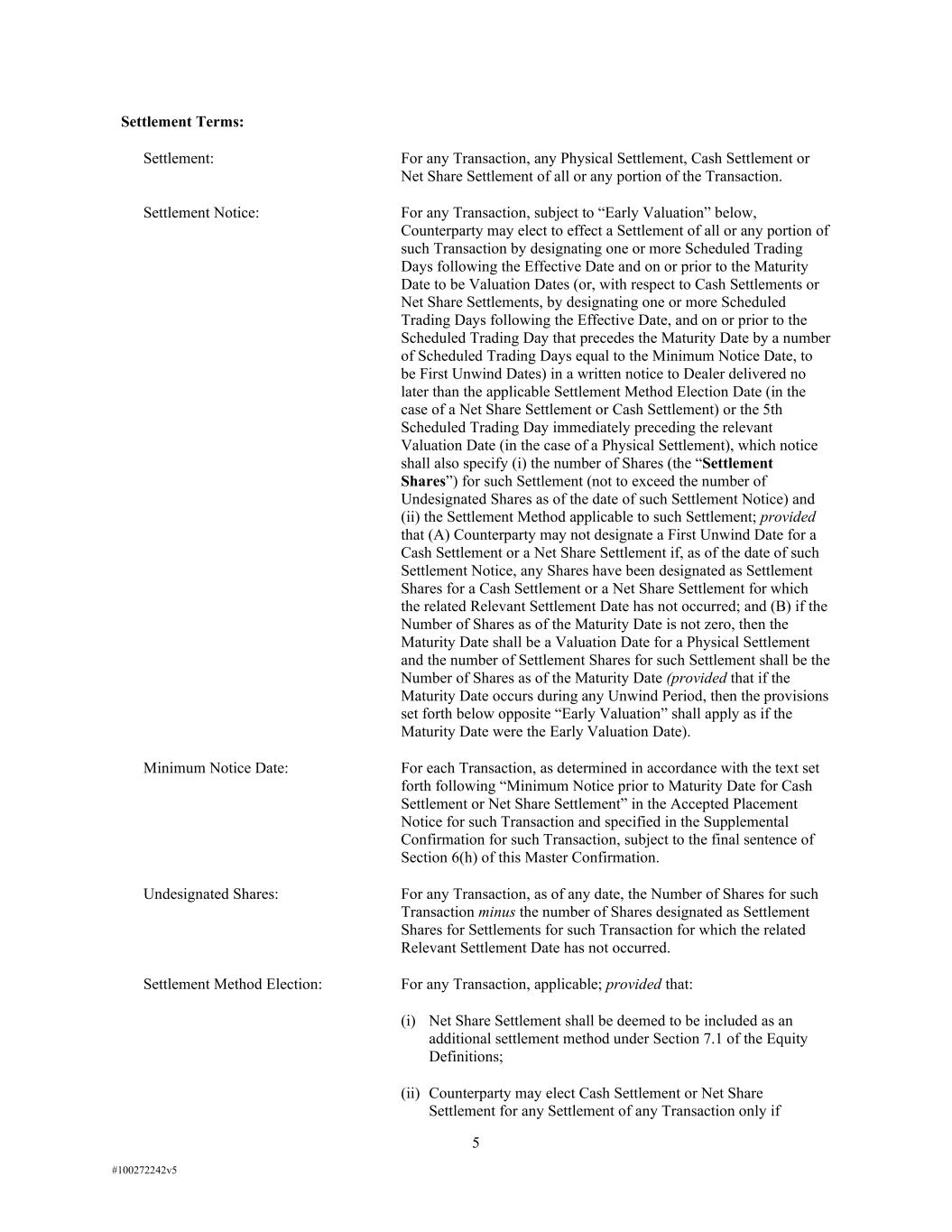5 #100272242v5 Settlement Terms: Settlement: For any Transaction, any Physical Settlement, Cash Settlement or Net Share Settlement of all or any portion of the Transaction. Settlement Notice: For any Transaction, subject to “Early Valuation” below, Counterparty may elect to effect a Settlement of all or any portion of such Transaction by designating one or more Scheduled Trading Days following the Effective Date and on or prior to the Maturity Date to be Valuation Dates (or, with respect to Cash Settlements or Net Share Settlements, by designating one or more Scheduled Trading Days following the Effective Date, and on or prior to the Scheduled Trading Day that precedes the Maturity Date by a number of Scheduled Trading Days equal to the Minimum Notice Date, to be First Unwind Dates) in a written notice to Dealer delivered no later than the applicable Settlement Method Election Date (in the case of a Net Share Settlement or Cash Settlement) or the 5th Scheduled Trading Day immediately preceding the relevant Valuation Date (in the case of a Physical Settlement), which notice shall also specify (i) the number of Shares (the “Settlement Shares”) for such Settlement (not to exceed the number of Undesignated Shares as of the date of such Settlement Notice) and (ii) the Settlement Method applicable to such Settlement; provided that (A) Counterparty may not designate a First Unwind Date for a Cash Settlement or a Net Share Settlement if, as of the date of such Settlement Notice, any Shares have been designated as Settlement Shares for a Cash Settlement or a Net Share Settlement for which the related Relevant Settlement Date has not occurred; and (B) if the Number of Shares as of the Maturity Date is not zero, then the Maturity Date shall be a Valuation Date for a Physical Settlement and the number of Settlement Shares for such Settlement shall be the Number of Shares as of the Maturity Date (provided that if the Maturity Date occurs during any Unwind Period, then the provisions set forth below opposite “Early Valuation” shall apply as if the Maturity Date were the Early Valuation Date). Minimum Notice Date: For each Transaction, as determined in accordance with the text set forth following “Minimum Notice prior to Maturity Date for Cash Settlement or Net Share Settlement” in the Accepted Placement Notice for such Transaction and specified in the Supplemental Confirmation for such Transaction, subject to the final sentence of Section 6(h) of this Master Confirmation. Undesignated Shares: For any Transaction, as of any date, the Number of Shares for such Transaction minus the number of Shares designated as Settlement Shares for Settlements for such Transaction for which the related Relevant Settlement Date has not occurred. Settlement Method Election: For any Transaction, applicable; provided that: (i) Net Share Settlement shall be deemed to be included as an additional settlement method under Section 7.1 of the Equity Definitions; (ii) Counterparty may elect Cash Settlement or Net Share Settlement for any Settlement of any Transaction only if