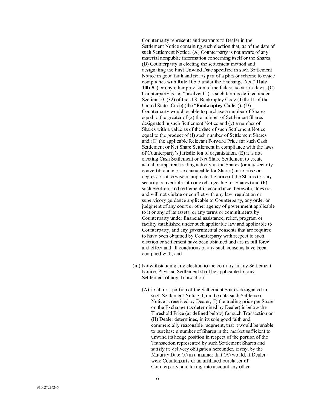 6 #100272242v5 Counterparty represents and warrants to Dealer in the Settlement Notice containing such election that, as of the date of such Settlement Notice, (A) Counterparty is not aware of any material nonpublic information concerning itself or the Shares, (B) Counterparty is electing the settlement method and designating the First Unwind Date specified in such Settlement Notice in good faith and not as part of a plan or scheme to evade compliance with Rule 10b-5 under the Exchange Act (“Rule 10b-5”) or any other provision of the federal securities laws, (C) Counterparty is not “insolvent” (as such term is defined under Section 101(32) of the U.S. Bankruptcy Code (Title 11 of the United States Code) (the “Bankruptcy Code”)), (D) Counterparty would be able to purchase a number of Shares equal to the greater of (x) the number of Settlement Shares designated in such Settlement Notice and (y) a number of Shares with a value as of the date of such Settlement Notice equal to the product of (I) such number of Settlement Shares and (II) the applicable Relevant Forward Price for such Cash Settlement or Net Share Settlement in compliance with the laws of Counterparty’s jurisdiction of organization, (E) it is not electing Cash Settlement or Net Share Settlement to create actual or apparent trading activity in the Shares (or any security convertible into or exchangeable for Shares) or to raise or depress or otherwise manipulate the price of the Shares (or any security convertible into or exchangeable for Shares) and (F) such election, and settlement in accordance therewith, does not and will not violate or conflict with any law, regulation or supervisory guidance applicable to Counterparty, any order or judgment of any court or other agency of government applicable to it or any of its assets, or any terms or commitments by Counterparty under financial assistance, relief, program or facility established under such applicable law and applicable to Counterparty, and any governmental consents that are required to have been obtained by Counterparty with respect to such election or settlement have been obtained and are in full force and effect and all conditions of any such consents have been complied with; and (iii) Notwithstanding any election to the contrary in any Settlement Notice, Physical Settlement shall be applicable for any Settlement of any Transaction: (A) to all or a portion of the Settlement Shares designated in such Settlement Notice if, on the date such Settlement Notice is received by Dealer, (I) the trading price per Share on the Exchange (as determined by Dealer) is below the Threshold Price (as defined below) for such Transaction or (II) Dealer determines, in its sole good faith and commercially reasonable judgment, that it would be unable to purchase a number of Shares in the market sufficient to unwind its hedge position in respect of the portion of the Transaction represented by such Settlement Shares and satisfy its delivery obligation hereunder, if any, by the Maturity Date (x) in a manner that (A) would, if Dealer were Counterparty or an affiliated purchaser of Counterparty, and taking into account any other