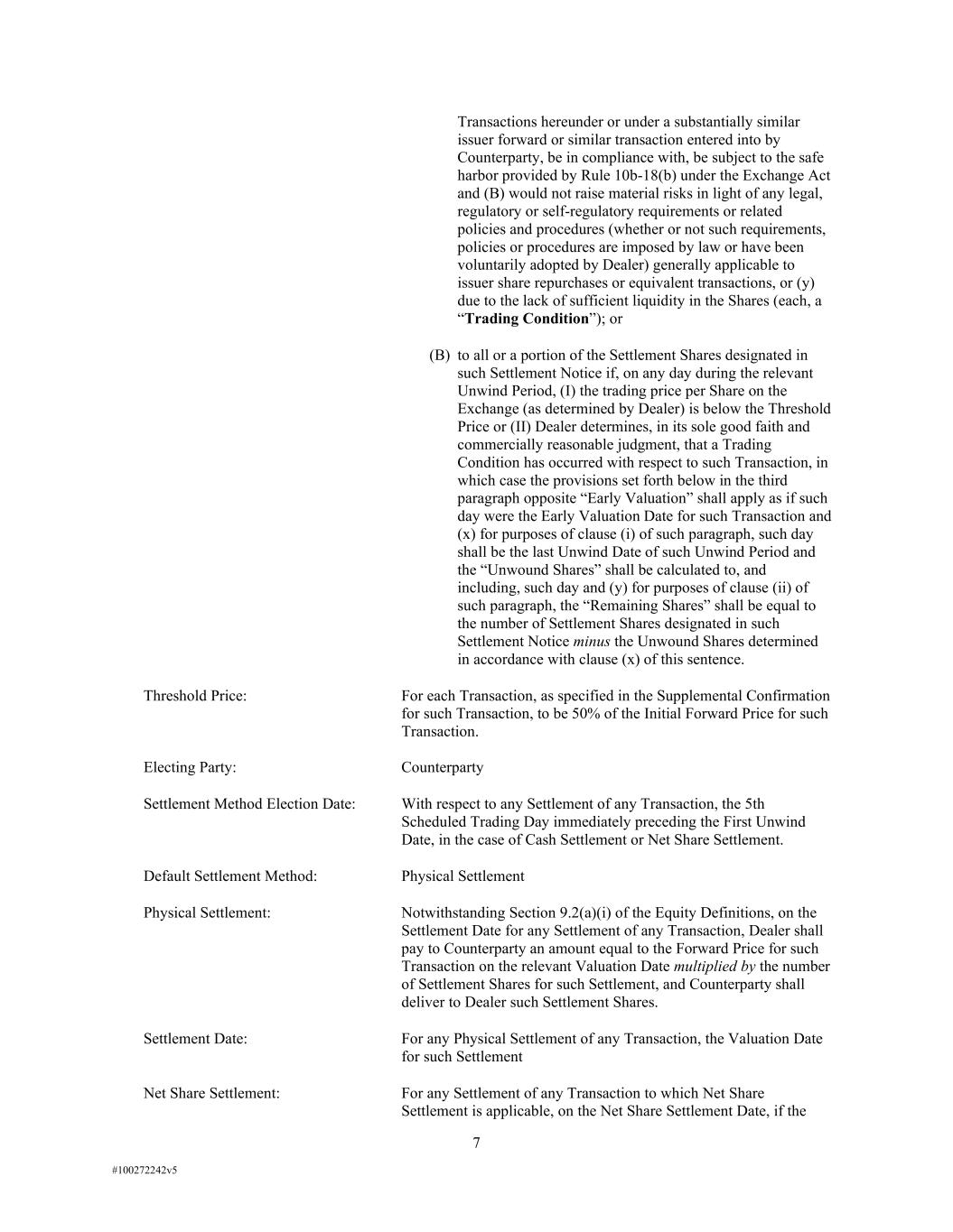 7 #100272242v5 Transactions hereunder or under a substantially similar issuer forward or similar transaction entered into by Counterparty, be in compliance with, be subject to the safe harbor provided by Rule 10b-18(b) under the Exchange Act and (B) would not raise material risks in light of any legal, regulatory or self-regulatory requirements or related policies and procedures (whether or not such requirements, policies or procedures are imposed by law or have been voluntarily adopted by Dealer) generally applicable to issuer share repurchases or equivalent transactions, or (y) due to the lack of sufficient liquidity in the Shares (each, a “Trading Condition”); or (B) to all or a portion of the Settlement Shares designated in such Settlement Notice if, on any day during the relevant Unwind Period, (I) the trading price per Share on the Exchange (as determined by Dealer) is below the Threshold Price or (II) Dealer determines, in its sole good faith and commercially reasonable judgment, that a Trading Condition has occurred with respect to such Transaction, in which case the provisions set forth below in the third paragraph opposite “Early Valuation” shall apply as if such day were the Early Valuation Date for such Transaction and (x) for purposes of clause (i) of such paragraph, such day shall be the last Unwind Date of such Unwind Period and the “Unwound Shares” shall be calculated to, and including, such day and (y) for purposes of clause (ii) of such paragraph, the “Remaining Shares” shall be equal to the number of Settlement Shares designated in such Settlement Notice minus the Unwound Shares determined in accordance with clause (x) of this sentence. Threshold Price: For each Transaction, as specified in the Supplemental Confirmation for such Transaction, to be 50% of the Initial Forward Price for such Transaction. Electing Party: Counterparty Settlement Method Election Date: With respect to any Settlement of any Transaction, the 5th Scheduled Trading Day immediately preceding the First Unwind Date, in the case of Cash Settlement or Net Share Settlement. Default Settlement Method: Physical Settlement Physical Settlement: Notwithstanding Section 9.2(a)(i) of the Equity Definitions, on the Settlement Date for any Settlement of any Transaction, Dealer shall pay to Counterparty an amount equal to the Forward Price for such Transaction on the relevant Valuation Date multiplied by the number of Settlement Shares for such Settlement, and Counterparty shall deliver to Dealer such Settlement Shares. Settlement Date: For any Physical Settlement of any Transaction, the Valuation Date for such Settlement Net Share Settlement: For any Settlement of any Transaction to which Net Share Settlement is applicable, on the Net Share Settlement Date, if the