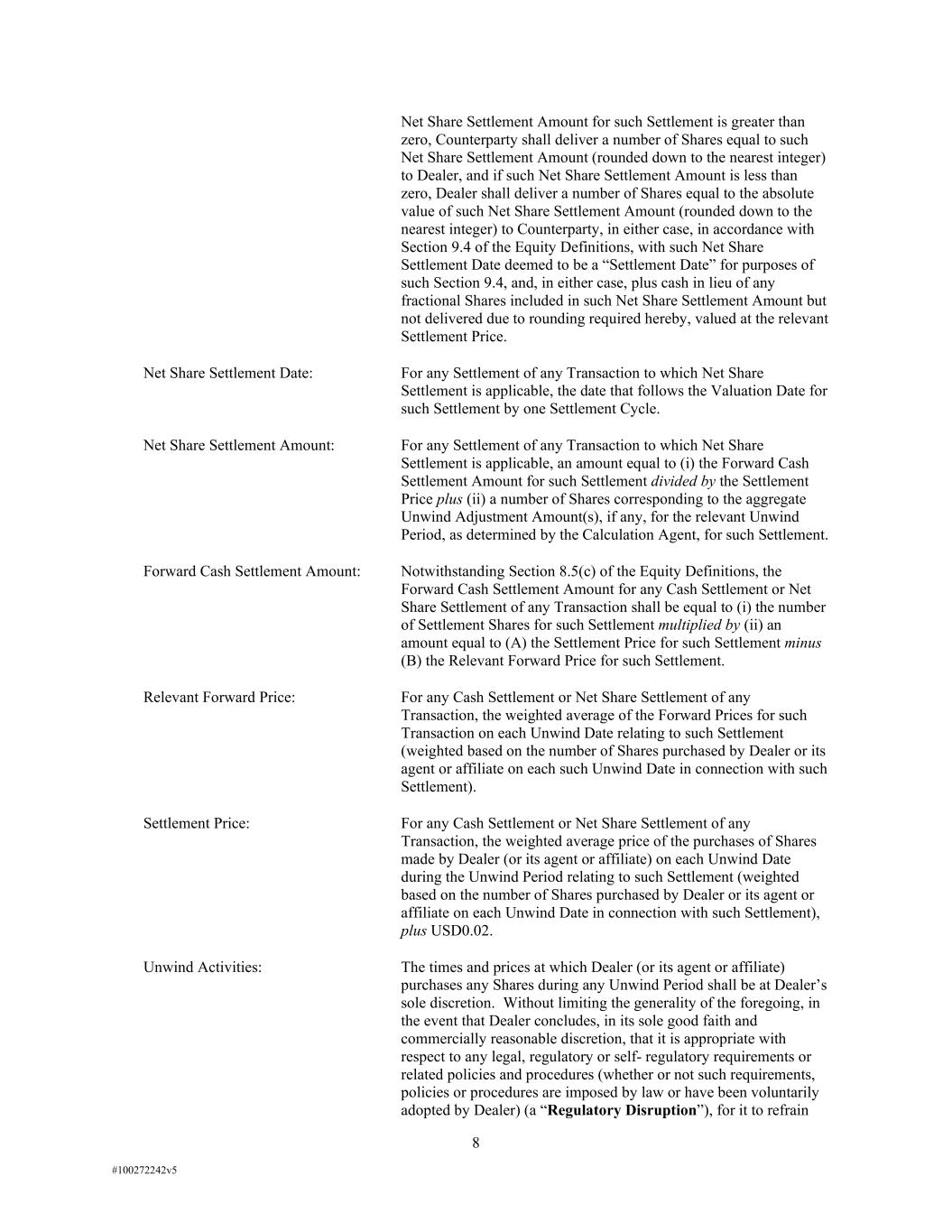 8 #100272242v5 Net Share Settlement Amount for such Settlement is greater than zero, Counterparty shall deliver a number of Shares equal to such Net Share Settlement Amount (rounded down to the nearest integer) to Dealer, and if such Net Share Settlement Amount is less than zero, Dealer shall deliver a number of Shares equal to the absolute value of such Net Share Settlement Amount (rounded down to the nearest integer) to Counterparty, in either case, in accordance with Section 9.4 of the Equity Definitions, with such Net Share Settlement Date deemed to be a “Settlement Date” for purposes of such Section 9.4, and, in either case, plus cash in lieu of any fractional Shares included in such Net Share Settlement Amount but not delivered due to rounding required hereby, valued at the relevant Settlement Price. Net Share Settlement Date: For any Settlement of any Transaction to which Net Share Settlement is applicable, the date that follows the Valuation Date for such Settlement by one Settlement Cycle. Net Share Settlement Amount: For any Settlement of any Transaction to which Net Share Settlement is applicable, an amount equal to (i) the Forward Cash Settlement Amount for such Settlement divided by the Settlement Price plus (ii) a number of Shares corresponding to the aggregate Unwind Adjustment Amount(s), if any, for the relevant Unwind Period, as determined by the Calculation Agent, for such Settlement. Forward Cash Settlement Amount: Notwithstanding Section 8.5(c) of the Equity Definitions, the Forward Cash Settlement Amount for any Cash Settlement or Net Share Settlement of any Transaction shall be equal to (i) the number of Settlement Shares for such Settlement multiplied by (ii) an amount equal to (A) the Settlement Price for such Settlement minus (B) the Relevant Forward Price for such Settlement. Relevant Forward Price: For any Cash Settlement or Net Share Settlement of any Transaction, the weighted average of the Forward Prices for such Transaction on each Unwind Date relating to such Settlement (weighted based on the number of Shares purchased by Dealer or its agent or affiliate on each such Unwind Date in connection with such Settlement). Settlement Price: For any Cash Settlement or Net Share Settlement of any Transaction, the weighted average price of the purchases of Shares made by Dealer (or its agent or affiliate) on each Unwind Date during the Unwind Period relating to such Settlement (weighted based on the number of Shares purchased by Dealer or its agent or affiliate on each Unwind Date in connection with such Settlement), plus USD0.02. Unwind Activities: The times and prices at which Dealer (or its agent or affiliate) purchases any Shares during any Unwind Period shall be at Dealer’s sole discretion. Without limiting the generality of the foregoing, in the event that Dealer concludes, in its sole good faith and commercially reasonable discretion, that it is appropriate with respect to any legal, regulatory or self- regulatory requirements or related policies and procedures (whether or not such requirements, policies or procedures are imposed by law or have been voluntarily adopted by Dealer) (a “Regulatory Disruption”), for it to refrain