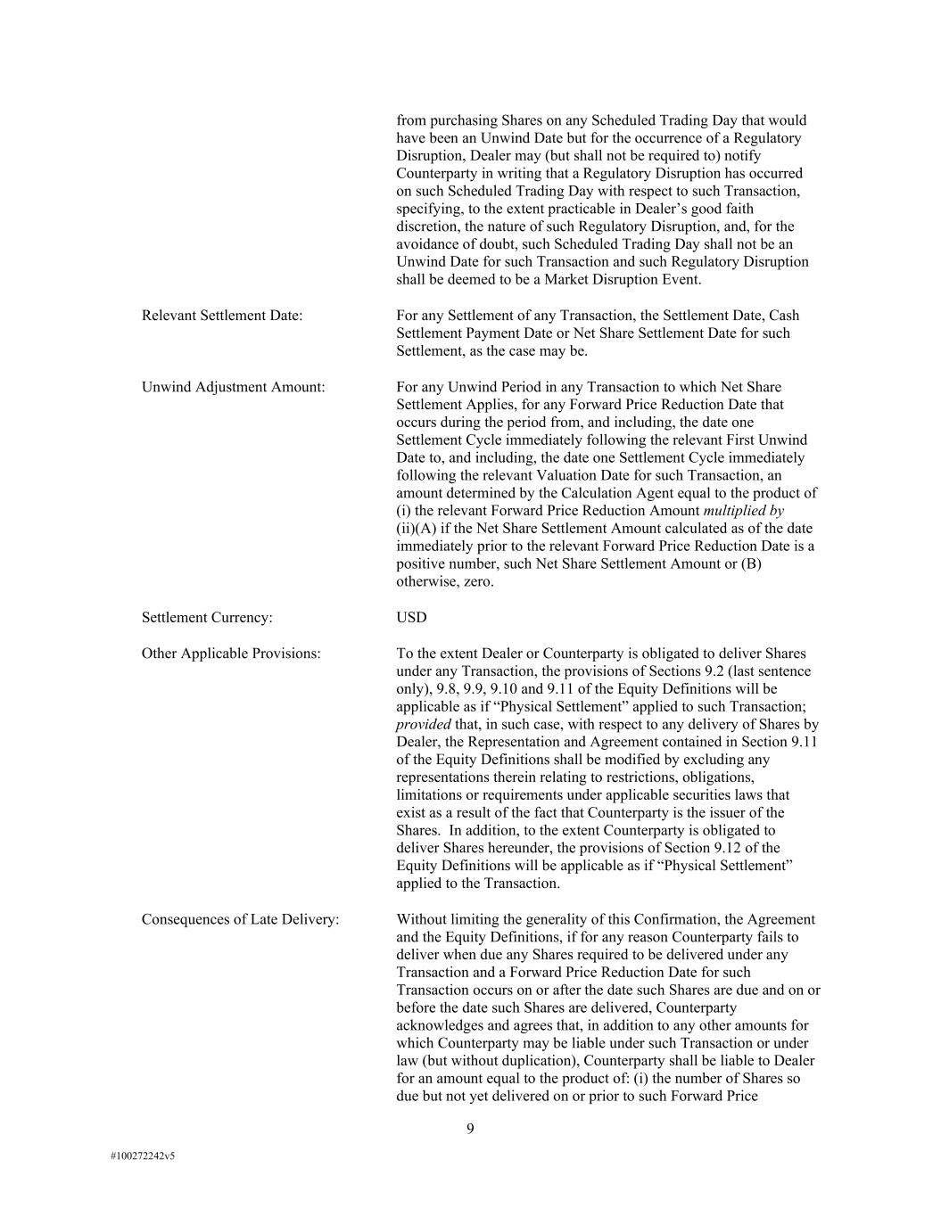 9 #100272242v5 from purchasing Shares on any Scheduled Trading Day that would have been an Unwind Date but for the occurrence of a Regulatory Disruption, Dealer may (but shall not be required to) notify Counterparty in writing that a Regulatory Disruption has occurred on such Scheduled Trading Day with respect to such Transaction, specifying, to the extent practicable in Dealer’s good faith discretion, the nature of such Regulatory Disruption, and, for the avoidance of doubt, such Scheduled Trading Day shall not be an Unwind Date for such Transaction and such Regulatory Disruption shall be deemed to be a Market Disruption Event. Relevant Settlement Date: For any Settlement of any Transaction, the Settlement Date, Cash Settlement Payment Date or Net Share Settlement Date for such Settlement, as the case may be. Unwind Adjustment Amount: For any Unwind Period in any Transaction to which Net Share Settlement Applies, for any Forward Price Reduction Date that occurs during the period from, and including, the date one Settlement Cycle immediately following the relevant First Unwind Date to, and including, the date one Settlement Cycle immediately following the relevant Valuation Date for such Transaction, an amount determined by the Calculation Agent equal to the product of (i) the relevant Forward Price Reduction Amount multiplied by (ii)(A) if the Net Share Settlement Amount calculated as of the date immediately prior to the relevant Forward Price Reduction Date is a positive number, such Net Share Settlement Amount or (B) otherwise, zero. Settlement Currency: USD Other Applicable Provisions: To the extent Dealer or Counterparty is obligated to deliver Shares under any Transaction, the provisions of Sections 9.2 (last sentence only), 9.8, 9.9, 9.10 and 9.11 of the Equity Definitions will be applicable as if “Physical Settlement” applied to such Transaction; provided that, in such case, with respect to any delivery of Shares by Dealer, the Representation and Agreement contained in Section 9.11 of the Equity Definitions shall be modified by excluding any representations therein relating to restrictions, obligations, limitations or requirements under applicable securities laws that exist as a result of the fact that Counterparty is the issuer of the Shares. In addition, to the extent Counterparty is obligated to deliver Shares hereunder, the provisions of Section 9.12 of the Equity Definitions will be applicable as if “Physical Settlement” applied to the Transaction. Consequences of Late Delivery: Without limiting the generality of this Confirmation, the Agreement and the Equity Definitions, if for any reason Counterparty fails to deliver when due any Shares required to be delivered under any Transaction and a Forward Price Reduction Date for such Transaction occurs on or after the date such Shares are due and on or before the date such Shares are delivered, Counterparty acknowledges and agrees that, in addition to any other amounts for which Counterparty may be liable under such Transaction or under law (but without duplication), Counterparty shall be liable to Dealer for an amount equal to the product of: (i) the number of Shares so due but not yet delivered on or prior to such Forward Price