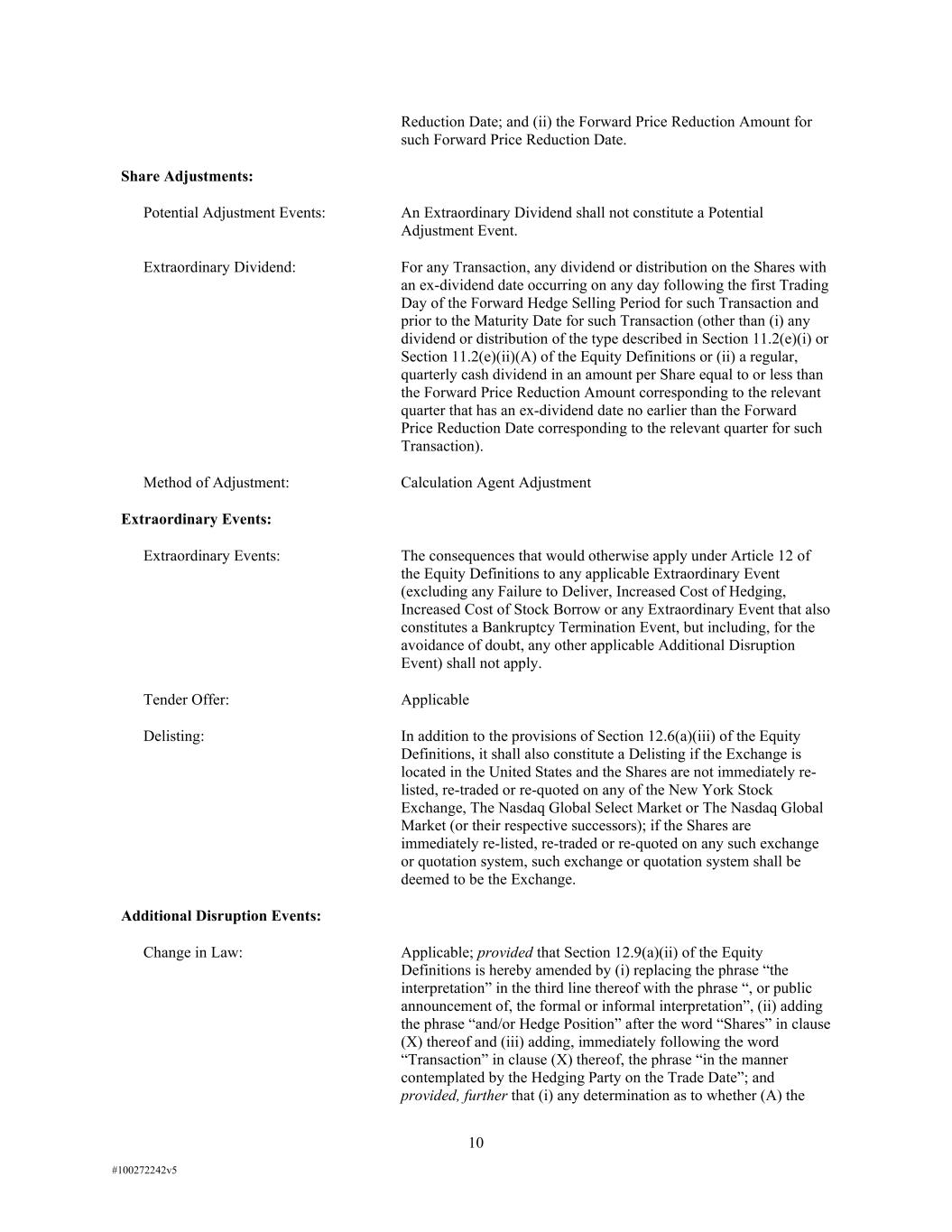 10 #100272242v5 Reduction Date; and (ii) the Forward Price Reduction Amount for such Forward Price Reduction Date. Share Adjustments: Potential Adjustment Events: An Extraordinary Dividend shall not constitute a Potential Adjustment Event. Extraordinary Dividend: For any Transaction, any dividend or distribution on the Shares with an ex-dividend date occurring on any day following the first Trading Day of the Forward Hedge Selling Period for such Transaction and prior to the Maturity Date for such Transaction (other than (i) any dividend or distribution of the type described in Section 11.2(e)(i) or Section 11.2(e)(ii)(A) of the Equity Definitions or (ii) a regular, quarterly cash dividend in an amount per Share equal to or less than the Forward Price Reduction Amount corresponding to the relevant quarter that has an ex-dividend date no earlier than the Forward Price Reduction Date corresponding to the relevant quarter for such Transaction). Method of Adjustment: Calculation Agent Adjustment Extraordinary Events: Extraordinary Events: The consequences that would otherwise apply under Article 12 of the Equity Definitions to any applicable Extraordinary Event (excluding any Failure to Deliver, Increased Cost of Hedging, Increased Cost of Stock Borrow or any Extraordinary Event that also constitutes a Bankruptcy Termination Event, but including, for the avoidance of doubt, any other applicable Additional Disruption Event) shall not apply. Tender Offer: Applicable Delisting: In addition to the provisions of Section 12.6(a)(iii) of the Equity Definitions, it shall also constitute a Delisting if the Exchange is located in the United States and the Shares are not immediately re- listed, re-traded or re-quoted on any of the New York Stock Exchange, The Nasdaq Global Select Market or The Nasdaq Global Market (or their respective successors); if the Shares are immediately re-listed, re-traded or re-quoted on any such exchange or quotation system, such exchange or quotation system shall be deemed to be the Exchange. Additional Disruption Events: Change in Law: Applicable; provided that Section 12.9(a)(ii) of the Equity Definitions is hereby amended by (i) replacing the phrase “the interpretation” in the third line thereof with the phrase “, or public announcement of, the formal or informal interpretation”, (ii) adding the phrase “and/or Hedge Position” after the word “Shares” in clause (X) thereof and (iii) adding, immediately following the word “Transaction” in clause (X) thereof, the phrase “in the manner contemplated by the Hedging Party on the Trade Date”; and provided, further that (i) any determination as to whether (A) the