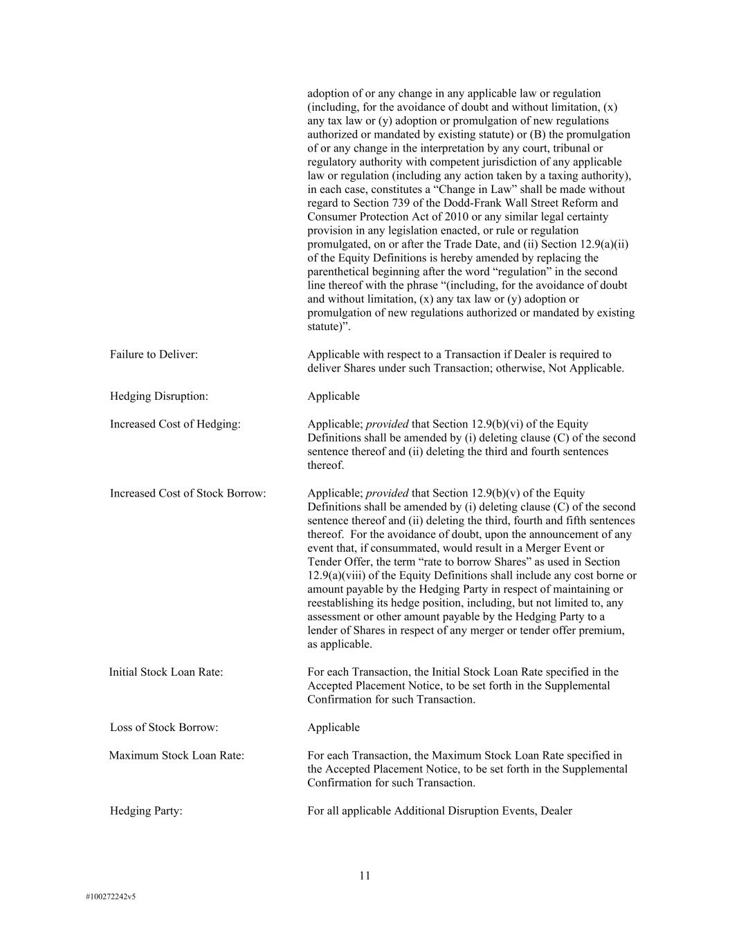 11 #100272242v5 adoption of or any change in any applicable law or regulation (including, for the avoidance of doubt and without limitation, (x) any tax law or (y) adoption or promulgation of new regulations authorized or mandated by existing statute) or (B) the promulgation of or any change in the interpretation by any court, tribunal or regulatory authority with competent jurisdiction of any applicable law or regulation (including any action taken by a taxing authority), in each case, constitutes a “Change in Law” shall be made without regard to Section 739 of the Dodd-Frank Wall Street Reform and Consumer Protection Act of 2010 or any similar legal certainty provision in any legislation enacted, or rule or regulation promulgated, on or after the Trade Date, and (ii) Section 12.9(a)(ii) of the Equity Definitions is hereby amended by replacing the parenthetical beginning after the word “regulation” in the second line thereof with the phrase “(including, for the avoidance of doubt and without limitation, (x) any tax law or (y) adoption or promulgation of new regulations authorized or mandated by existing statute)”. Failure to Deliver: Applicable with respect to a Transaction if Dealer is required to deliver Shares under such Transaction; otherwise, Not Applicable. Hedging Disruption: Applicable Increased Cost of Hedging: Applicable; provided that Section 12.9(b)(vi) of the Equity Definitions shall be amended by (i) deleting clause (C) of the second sentence thereof and (ii) deleting the third and fourth sentences thereof. Increased Cost of Stock Borrow: Applicable; provided that Section 12.9(b)(v) of the Equity Definitions shall be amended by (i) deleting clause (C) of the second sentence thereof and (ii) deleting the third, fourth and fifth sentences thereof. For the avoidance of doubt, upon the announcement of any event that, if consummated, would result in a Merger Event or Tender Offer, the term “rate to borrow Shares” as used in Section 12.9(a)(viii) of the Equity Definitions shall include any cost borne or amount payable by the Hedging Party in respect of maintaining or reestablishing its hedge position, including, but not limited to, any assessment or other amount payable by the Hedging Party to a lender of Shares in respect of any merger or tender offer premium, as applicable. Initial Stock Loan Rate: For each Transaction, the Initial Stock Loan Rate specified in the Accepted Placement Notice, to be set forth in the Supplemental Confirmation for such Transaction. Loss of Stock Borrow: Applicable Maximum Stock Loan Rate: For each Transaction, the Maximum Stock Loan Rate specified in the Accepted Placement Notice, to be set forth in the Supplemental Confirmation for such Transaction. Hedging Party: For all applicable Additional Disruption Events, Dealer