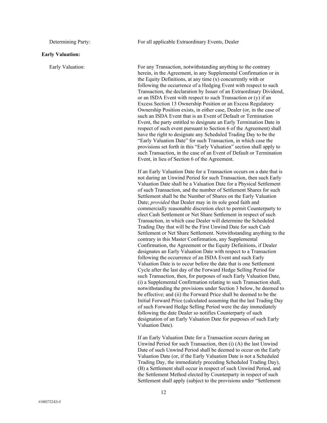 12 #100272242v5 Determining Party: For all applicable Extraordinary Events, Dealer Early Valuation: Early Valuation: For any Transaction, notwithstanding anything to the contrary herein, in the Agreement, in any Supplemental Confirmation or in the Equity Definitions, at any time (x) concurrently with or following the occurrence of a Hedging Event with respect to such Transaction, the declaration by Issuer of an Extraordinary Dividend, or an ISDA Event with respect to such Transaction or (y) if an Excess Section 13 Ownership Position or an Excess Regulatory Ownership Position exists, in either case, Dealer (or, in the case of such an ISDA Event that is an Event of Default or Termination Event, the party entitled to designate an Early Termination Date in respect of such event pursuant to Section 6 of the Agreement) shall have the right to designate any Scheduled Trading Day to be the “Early Valuation Date” for such Transaction, in which case the provisions set forth in this “Early Valuation” section shall apply to such Transaction, in the case of an Event of Default or Termination Event, in lieu of Section 6 of the Agreement. If an Early Valuation Date for a Transaction occurs on a date that is not during an Unwind Period for such Transaction, then such Early Valuation Date shall be a Valuation Date for a Physical Settlement of such Transaction, and the number of Settlement Shares for such Settlement shall be the Number of Shares on the Early Valuation Date; provided that Dealer may in its sole good faith and commercially reasonable discretion elect to permit Counterparty to elect Cash Settlement or Net Share Settlement in respect of such Transaction, in which case Dealer will determine the Scheduled Trading Day that will be the First Unwind Date for such Cash Settlement or Net Share Settlement. Notwithstanding anything to the contrary in this Master Confirmation, any Supplemental Confirmation, the Agreement or the Equity Definitions, if Dealer designates an Early Valuation Date with respect to a Transaction following the occurrence of an ISDA Event and such Early Valuation Date is to occur before the date that is one Settlement Cycle after the last day of the Forward Hedge Selling Period for such Transaction, then, for purposes of such Early Valuation Date, (i) a Supplemental Confirmation relating to such Transaction shall, notwithstanding the provisions under Section 3 below, be deemed to be effective; and (ii) the Forward Price shall be deemed to be the Initial Forward Price (calculated assuming that the last Trading Day of such Forward Hedge Selling Period were the day immediately following the date Dealer so notifies Counterparty of such designation of an Early Valuation Date for purposes of such Early Valuation Date). If an Early Valuation Date for a Transaction occurs during an Unwind Period for such Transaction, then (i) (A) the last Unwind Date of such Unwind Period shall be deemed to occur on the Early Valuation Date (or, if the Early Valuation Date is not a Scheduled Trading Day, the immediately preceding Scheduled Trading Day), (B) a Settlement shall occur in respect of such Unwind Period, and the Settlement Method elected by Counterparty in respect of such Settlement shall apply (subject to the provisions under “Settlement