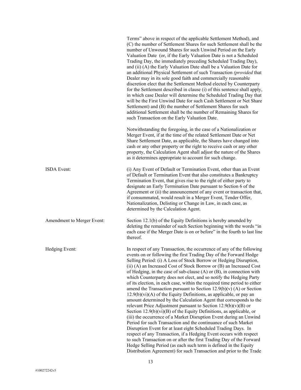 13 #100272242v5 Terms” above in respect of the applicable Settlement Method), and (C) the number of Settlement Shares for such Settlement shall be the number of Unwound Shares for such Unwind Period on the Early Valuation Date (or, if the Early Valuation Date is not a Scheduled Trading Day, the immediately preceding Scheduled Trading Day), and (ii) (A) the Early Valuation Date shall be a Valuation Date for an additional Physical Settlement of such Transaction (provided that Dealer may in its sole good faith and commercially reasonable discretion elect that the Settlement Method elected by Counterparty for the Settlement described in clause (i) of this sentence shall apply, in which case Dealer will determine the Scheduled Trading Day that will be the First Unwind Date for such Cash Settlement or Net Share Settlement) and (B) the number of Settlement Shares for such additional Settlement shall be the number of Remaining Shares for such Transaction on the Early Valuation Date. Notwithstanding the foregoing, in the case of a Nationalization or Merger Event, if at the time of the related Settlement Date or Net Share Settlement Date, as applicable, the Shares have changed into cash or any other property or the right to receive cash or any other property, the Calculation Agent shall adjust the nature of the Shares as it determines appropriate to account for such change. ISDA Event: (i) Any Event of Default or Termination Event, other than an Event of Default or Termination Event that also constitutes a Bankruptcy Termination Event, that gives rise to the right of either party to designate an Early Termination Date pursuant to Section 6 of the Agreement or (ii) the announcement of any event or transaction that, if consummated, would result in a Merger Event, Tender Offer, Nationalization, Delisting or Change in Law, in each case, as determined by the Calculation Agent. Amendment to Merger Event: Section 12.1(b) of the Equity Definitions is hereby amended by deleting the remainder of such Section beginning with the words “in each case if the Merger Date is on or before” in the fourth to last line thereof. Hedging Event: In respect of any Transaction, the occurrence of any of the following events on or following the first Trading Day of the Forward Hedge Selling Period: (i) A Loss of Stock Borrow or Hedging Disruption, (ii) (A) an Increased Cost of Stock Borrow or (B) an Increased Cost of Hedging, in the case of sub-clause (A) or (B), in connection with which Counterparty does not elect, and so notify the Hedging Party of its election, in each case, within the required time period to either amend the Transaction pursuant to Section 12.9(b)(v) (A) or Section 12.9(b)(vi)(A) of the Equity Definitions, as applicable, or pay an amount determined by the Calculation Agent that corresponds to the relevant Price Adjustment pursuant to Section 12.9(b)(v)(B) or Section 12.9(b)(vi)(B) of the Equity Definitions, as applicable, or (iii) the occurrence of a Market Disruption Event during an Unwind Period for such Transaction and the continuance of such Market Disruption Event for at least eight Scheduled Trading Days. In respect of any Transaction, if a Hedging Event occurs with respect to such Transaction on or after the first Trading Day of the Forward Hedge Selling Period (as each such term is defined in the Equity Distribution Agreement) for such Transaction and prior to the Trade