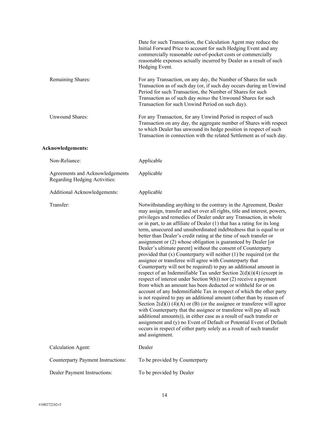 14 #100272242v5 Date for such Transaction, the Calculation Agent may reduce the Initial Forward Price to account for such Hedging Event and any commercially reasonable out-of-pocket costs or commercially reasonable expenses actually incurred by Dealer as a result of such Hedging Event. Remaining Shares: For any Transaction, on any day, the Number of Shares for such Transaction as of such day (or, if such day occurs during an Unwind Period for such Transaction, the Number of Shares for such Transaction as of such day minus the Unwound Shares for such Transaction for such Unwind Period on such day). Unwound Shares: For any Transaction, for any Unwind Period in respect of such Transaction on any day, the aggregate number of Shares with respect to which Dealer has unwound its hedge position in respect of such Transaction in connection with the related Settlement as of such day. Acknowledgements: Non-Reliance: Applicable Agreements and Acknowledgements Regarding Hedging Activities: Applicable Additional Acknowledgements: Applicable Transfer: Notwithstanding anything to the contrary in the Agreement, Dealer may assign, transfer and set over all rights, title and interest, powers, privileges and remedies of Dealer under any Transaction, in whole or in part, to an affiliate of Dealer (1) that has a rating for its long term, unsecured and unsubordinated indebtedness that is equal to or better than Dealer’s credit rating at the time of such transfer or assignment or (2) whose obligation is guaranteed by Dealer [or Dealer’s ultimate parent] without the consent of Counterparty provided that (x) Counterparty will neither (1) be required (or the assignee or transferee will agree with Counterparty that Counterparty will not be required) to pay an additional amount in respect of an Indemnifiable Tax under Section 2(d)(i)(4) (except in respect of interest under Section 9(h)) nor (2) receive a payment from which an amount has been deducted or withheld for or on account of any Indemnifiable Tax in respect of which the other party is not required to pay an additional amount (other than by reason of Section 2(d)(i) (4)(A) or (B) (or the assignee or transferee will agree with Counterparty that the assignee or transferee will pay all such additional amounts)), in either case as a result of such transfer or assignment and (y) no Event of Default or Potential Event of Default occurs in respect of either party solely as a result of such transfer and assignment. Calculation Agent: Dealer Counterparty Payment Instructions: To be provided by Counterparty Dealer Payment Instructions: To be provided by Dealer