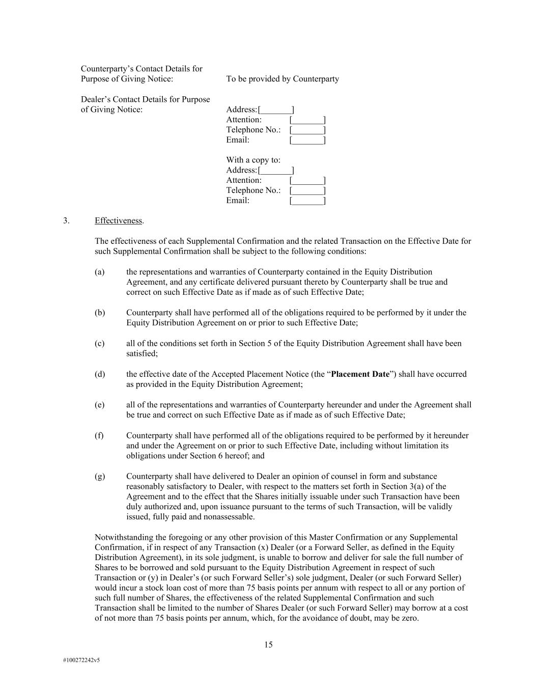 15 #100272242v5 Counterparty’s Contact Details for Purpose of Giving Notice: To be provided by Counterparty Dealer’s Contact Details for Purpose of Giving Notice: Address: [_______] Attention: [_______] Telephone No.: [_______] Email: [_______] With a copy to: Address: [_______] Attention: [_______] Telephone No.: [_______] Email: [_______] 3. Effectiveness. The effectiveness of each Supplemental Confirmation and the related Transaction on the Effective Date for such Supplemental Confirmation shall be subject to the following conditions: (a) the representations and warranties of Counterparty contained in the Equity Distribution Agreement, and any certificate delivered pursuant thereto by Counterparty shall be true and correct on such Effective Date as if made as of such Effective Date; (b) Counterparty shall have performed all of the obligations required to be performed by it under the Equity Distribution Agreement on or prior to such Effective Date; (c) all of the conditions set forth in Section 5 of the Equity Distribution Agreement shall have been satisfied; (d) the effective date of the Accepted Placement Notice (the “Placement Date”) shall have occurred as provided in the Equity Distribution Agreement; (e) all of the representations and warranties of Counterparty hereunder and under the Agreement shall be true and correct on such Effective Date as if made as of such Effective Date; (f) Counterparty shall have performed all of the obligations required to be performed by it hereunder and under the Agreement on or prior to such Effective Date, including without limitation its obligations under Section 6 hereof; and (g) Counterparty shall have delivered to Dealer an opinion of counsel in form and substance reasonably satisfactory to Dealer, with respect to the matters set forth in Section 3(a) of the Agreement and to the effect that the Shares initially issuable under such Transaction have been duly authorized and, upon issuance pursuant to the terms of such Transaction, will be validly issued, fully paid and nonassessable. Notwithstanding the foregoing or any other provision of this Master Confirmation or any Supplemental Confirmation, if in respect of any Transaction (x) Dealer (or a Forward Seller, as defined in the Equity Distribution Agreement), in its sole judgment, is unable to borrow and deliver for sale the full number of Shares to be borrowed and sold pursuant to the Equity Distribution Agreement in respect of such Transaction or (y) in Dealer’s (or such Forward Seller’s) sole judgment, Dealer (or such Forward Seller) would incur a stock loan cost of more than 75 basis points per annum with respect to all or any portion of such full number of Shares, the effectiveness of the related Supplemental Confirmation and such Transaction shall be limited to the number of Shares Dealer (or such Forward Seller) may borrow at a cost of not more than 75 basis points per annum, which, for the avoidance of doubt, may be zero.