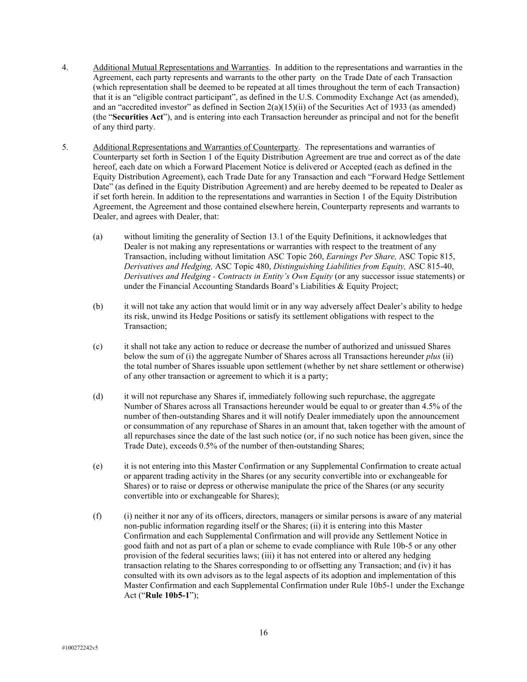 16 #100272242v5 4. Additional Mutual Representations and Warranties. In addition to the representations and warranties in the Agreement, each party represents and warrants to the other party on the Trade Date of each Transaction (which representation shall be deemed to be repeated at all times throughout the term of each Transaction) that it is an “eligible contract participant”, as defined in the U.S. Commodity Exchange Act (as amended), and an “accredited investor” as defined in Section 2(a)(15)(ii) of the Securities Act of 1933 (as amended) (the “Securities Act”), and is entering into each Transaction hereunder as principal and not for the benefit of any third party. 5. Additional Representations and Warranties of Counterparty. The representations and warranties of Counterparty set forth in Section 1 of the Equity Distribution Agreement are true and correct as of the date hereof, each date on which a Forward Placement Notice is delivered or Accepted (each as defined in the Equity Distribution Agreement), each Trade Date for any Transaction and each “Forward Hedge Settlement Date” (as defined in the Equity Distribution Agreement) and are hereby deemed to be repeated to Dealer as if set forth herein. In addition to the representations and warranties in Section 1 of the Equity Distribution Agreement, the Agreement and those contained elsewhere herein, Counterparty represents and warrants to Dealer, and agrees with Dealer, that: (a) without limiting the generality of Section 13.1 of the Equity Definitions, it acknowledges that Dealer is not making any representations or warranties with respect to the treatment of any Transaction, including without limitation ASC Topic 260, Earnings Per Share, ASC Topic 815, Derivatives and Hedging, ASC Topic 480, Distinguishing Liabilities from Equity, ASC 815-40, Derivatives and Hedging - Contracts in Entity’s Own Equity (or any successor issue statements) or under the Financial Accounting Standards Board’s Liabilities & Equity Project; (b) it will not take any action that would limit or in any way adversely affect Dealer’s ability to hedge its risk, unwind its Hedge Positions or satisfy its settlement obligations with respect to the Transaction; (c) it shall not take any action to reduce or decrease the number of authorized and unissued Shares below the sum of (i) the aggregate Number of Shares across all Transactions hereunder plus (ii) the total number of Shares issuable upon settlement (whether by net share settlement or otherwise) of any other transaction or agreement to which it is a party; (d) it will not repurchase any Shares if, immediately following such repurchase, the aggregate Number of Shares across all Transactions hereunder would be equal to or greater than 4.5% of the number of then-outstanding Shares and it will notify Dealer immediately upon the announcement or consummation of any repurchase of Shares in an amount that, taken together with the amount of all repurchases since the date of the last such notice (or, if no such notice has been given, since the Trade Date), exceeds 0.5% of the number of then-outstanding Shares; (e) it is not entering into this Master Confirmation or any Supplemental Confirmation to create actual or apparent trading activity in the Shares (or any security convertible into or exchangeable for Shares) or to raise or depress or otherwise manipulate the price of the Shares (or any security convertible into or exchangeable for Shares); (f) (i) neither it nor any of its officers, directors, managers or similar persons is aware of any material non-public information regarding itself or the Shares; (ii) it is entering into this Master Confirmation and each Supplemental Confirmation and will provide any Settlement Notice in good faith and not as part of a plan or scheme to evade compliance with Rule 10b-5 or any other provision of the federal securities laws; (iii) it has not entered into or altered any hedging transaction relating to the Shares corresponding to or offsetting any Transaction; and (iv) it has consulted with its own advisors as to the legal aspects of its adoption and implementation of this Master Confirmation and each Supplemental Confirmation under Rule 10b5-1 under the Exchange Act (“Rule 10b5-1”);