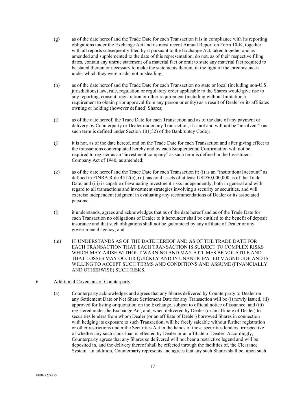 17 #100272242v5 (g) as of the date hereof and the Trade Date for each Transaction it is in compliance with its reporting obligations under the Exchange Act and its most recent Annual Report on Form 10-K, together with all reports subsequently filed by it pursuant to the Exchange Act, taken together and as amended and supplemented to the date of this representation, do not, as of their respective filing dates, contain any untrue statement of a material fact or omit to state any material fact required to be stated therein or necessary to make the statements therein, in the light of the circumstances under which they were made, not misleading; (h) as of the date hereof and the Trade Date for each Transaction no state or local (including non-U.S. jurisdictions) law, rule, regulation or regulatory order applicable to the Shares would give rise to any reporting, consent, registration or other requirement (including without limitation a requirement to obtain prior approval from any person or entity) as a result of Dealer or its affiliates owning or holding (however defined) Shares; (i) as of the date hereof, the Trade Date for each Transaction and as of the date of any payment or delivery by Counterparty or Dealer under any Transaction, it is not and will not be “insolvent” (as such term is defined under Section 101(32) of the Bankruptcy Code); (j) it is not, as of the date hereof, and on the Trade Date for each Transaction and after giving effect to the transactions contemplated hereby and by each Supplemental Confirmation will not be, required to register as an “investment company” as such term is defined in the Investment Company Act of 1940, as amended; (k) as of the date hereof and the Trade Date for each Transaction it: (i) is an “institutional account” as defined in FINRA Rule 4512(c); (ii) has total assets of at least USD50,000,000 as of the Trade Date; and (iii) is capable of evaluating investment risks independently, both in general and with regard to all transactions and investment strategies involving a security or securities, and will exercise independent judgment in evaluating any recommendations of Dealer or its associated persons; (l) it understands, agrees and acknowledges that as of the date hereof and as of the Trade Date for each Transaction no obligations of Dealer to it hereunder shall be entitled to the benefit of deposit insurance and that such obligations shall not be guaranteed by any affiliate of Dealer or any governmental agency; and (m) IT UNDERSTANDS AS OF THE DATE HEREOF AND AS OF THE TRADE DATE FOR EACH TRANSACTION THAT EACH TRANSACTION IS SUBJECT TO COMPLEX RISKS WHICH MAY ARISE WITHOUT WARNING AND MAY AT TIMES BE VOLATILE AND THAT LOSSES MAY OCCUR QUICKLY AND IN UNANTICIPATED MAGNITUDE AND IS WILLING TO ACCEPT SUCH TERMS AND CONDITIONS AND ASSUME (FINANCIALLY AND OTHERWISE) SUCH RISKS. 6. Additional Covenants of Counterparty. (a) Counterparty acknowledges and agrees that any Shares delivered by Counterparty to Dealer on any Settlement Date or Net Share Settlement Date for any Transaction will be (i) newly issued, (ii) approved for listing or quotation on the Exchange, subject to official notice of issuance, and (iii) registered under the Exchange Act, and, when delivered by Dealer (or an affiliate of Dealer) to securities lenders from whom Dealer (or an affiliate of Dealer) borrowed Shares in connection with hedging its exposure to such Transaction, will be freely saleable without further registration or other restrictions under the Securities Act in the hands of those securities lenders, irrespective of whether any such stock loan is effected by Dealer or an affiliate of Dealer. Accordingly, Counterparty agrees that any Shares so delivered will not bear a restrictive legend and will be deposited in, and the delivery thereof shall be effected through the facilities of, the Clearance System. In addition, Counterparty represents and agrees that any such Shares shall be, upon such
