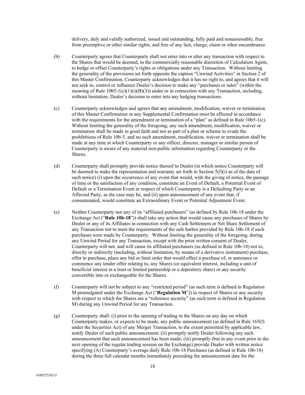 18 #100272242v5 delivery, duly and validly authorized, issued and outstanding, fully paid and nonassessable, free from preemptive or other similar rights, and free of any lien, charge, claim or other encumbrance. (b) Counterparty agrees that Counterparty shall not enter into or alter any transaction with respect to the Shares that would be deemed, in the commercially reasonable discretion of Calculation Agent, to hedge or offset Counterparty’s rights or obligations under any Transaction. Without limiting the generality of the provisions set forth opposite the caption “Unwind Activities” in Section 2 of this Master Confirmation, Counterparty acknowledges that it has no right to, and agrees that it will not seek to, control or influence Dealer’s decision to make any “purchases or sales” (within the meaning of Rule 10b5-1(c)(1)(i)(B)(3)) under or in connection with any Transaction, including, without limitation, Dealer’s decision to enter into any hedging transactions. (c) Counterparty acknowledges and agrees that any amendment, modification, waiver or termination of this Master Confirmation or any Supplemental Confirmation must be effected in accordance with the requirements for the amendment or termination of a “plan” as defined in Rule 10b5-1(c). Without limiting the generality of the foregoing, any such amendment, modification, waiver or termination shall be made in good faith and not as part of a plan or scheme to evade the prohibitions of Rule 10b-5, and no such amendment, modification, waiver or termination shall be made at any time at which Counterparty or any officer, director, manager or similar person of Counterparty is aware of any material non-public information regarding Counterparty or the Shares. (d) Counterparty shall promptly provide notice thereof to Dealer (in which notice Counterparty will be deemed to make the representation and warranty set forth in Section 5(f)(i) as of the date of such notice) (i) upon the occurrence of any event that would, with the giving of notice, the passage of time or the satisfaction of any condition, constitute an Event of Default, a Potential Event of Default or a Termination Event in respect of which Counterparty is a Defaulting Party or an Affected Party, as the case may be, and (ii) upon announcement of any event that, if consummated, would constitute an Extraordinary Event or Potential Adjustment Event. (e) Neither Counterparty nor any of its “affiliated purchasers” (as defined by Rule 10b-18 under the Exchange Act (“Rule 10b-18”)) shall take any action that would cause any purchases of Shares by Dealer or any of its Affiliates in connection with any Cash Settlement or Net Share Settlement of any Transaction not to meet the requirements of the safe harbor provided by Rule 10b-18 if such purchases were made by Counterparty. Without limiting the generality of the foregoing, during any Unwind Period for any Transaction, except with the prior written consent of Dealer, Counterparty will not, and will cause its affiliated purchasers (as defined in Rule 10b-18) not to, directly or indirectly (including, without limitation, by means of a derivative instrument) purchase, offer to purchase, place any bid or limit order that would effect a purchase of, or announce or commence any tender offer relating to, any Shares (or equivalent interest, including a unit of beneficial interest in a trust or limited partnership or a depository share) or any security convertible into or exchangeable for the Shares. (f) Counterparty will not be subject to any “restricted period” (as such term is defined in Regulation M promulgated under the Exchange Act (“Regulation M”)) in respect of Shares or any security with respect to which the Shares are a “reference security” (as such term is defined in Regulation M) during any Unwind Period for any Transaction. (g) Counterparty shall: (i) prior to the opening of trading in the Shares on any day on which Counterparty makes, or expects to be made, any public announcement (as defined in Rule 165(f) under the Securities Act) of any Merger Transaction, to the extent permitted by applicable law, notify Dealer of such public announcement; (ii) promptly notify Dealer following any such announcement that such announcement has been made; (iii) promptly (but in any event prior to the next opening of the regular trading session on the Exchange) provide Dealer with written notice specifying (A) Counterparty’s average daily Rule 10b-18 Purchases (as defined in Rule 10b-18) during the three full calendar months immediately preceding the announcement date for the