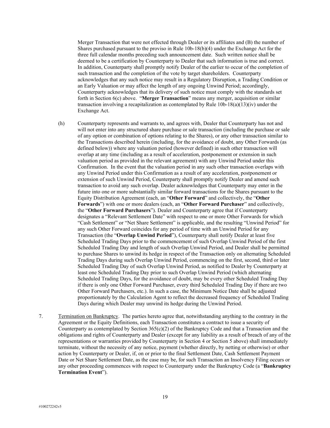 19 #100272242v5 Merger Transaction that were not effected through Dealer or its affiliates and (B) the number of Shares purchased pursuant to the proviso in Rule 10b-18(b)(4) under the Exchange Act for the three full calendar months preceding such announcement date. Such written notice shall be deemed to be a certification by Counterparty to Dealer that such information is true and correct. In addition, Counterparty shall promptly notify Dealer of the earlier to occur of the completion of such transaction and the completion of the vote by target shareholders. Counterparty acknowledges that any such notice may result in a Regulatory Disruption, a Trading Condition or an Early Valuation or may affect the length of any ongoing Unwind Period; accordingly, Counterparty acknowledges that its delivery of such notice must comply with the standards set forth in Section 6(c) above. “Merger Transaction” means any merger, acquisition or similar transaction involving a recapitalization as contemplated by Rule 10b-18(a)(13)(iv) under the Exchange Act. (h) Counterparty represents and warrants to, and agrees with, Dealer that Counterparty has not and will not enter into any structured share purchase or sale transaction (including the purchase or sale of any option or combination of options relating to the Shares), or any other transaction similar to the Transactions described herein (including, for the avoidance of doubt, any Other Forwards (as defined below)) where any valuation period (however defined) in such other transaction will overlap at any time (including as a result of acceleration, postponement or extension in such valuation period as provided in the relevant agreement) with any Unwind Period under this Confirmation. In the event that the valuation period in any such other transaction overlaps with any Unwind Period under this Confirmation as a result of any acceleration, postponement or extension of such Unwind Period, Counterparty shall promptly notify Dealer and amend such transaction to avoid any such overlap. Dealer acknowledges that Counterparty may enter in the future into one or more substantially similar forward transactions for the Shares pursuant to the Equity Distribution Agreement (each, an “Other Forward” and collectively, the “Other Forwards”) with one or more dealers (each, an “Other Forward Purchaser” and collectively, the “Other Forward Purchasers”). Dealer and Counterparty agree that if Counterparty designates a “Relevant Settlement Date” with respect to one or more Other Forwards for which “Cash Settlement” or “Net Share Settlement” is applicable, and the resulting “Unwind Period” for any such Other Forward coincides for any period of time with an Unwind Period for any Transaction (the “Overlap Unwind Period”), Counterparty shall notify Dealer at least five Scheduled Trading Days prior to the commencement of such Overlap Unwind Period of the first Scheduled Trading Day and length of such Overlap Unwind Period, and Dealer shall be permitted to purchase Shares to unwind its hedge in respect of the Transaction only on alternating Scheduled Trading Days during such Overlap Unwind Period, commencing on the first, second, third or later Scheduled Trading Day of such Overlap Unwind Period, as notified to Dealer by Counterparty at least one Scheduled Trading Day prior to such Overlap Unwind Period (which alternating Scheduled Trading Days, for the avoidance of doubt, may be every other Scheduled Trading Day if there is only one Other Forward Purchaser, every third Scheduled Trading Day if there are two Other Forward Purchasers, etc.). In such a case, the Minimum Notice Date shall be adjusted proportionately by the Calculation Agent to reflect the decreased frequency of Scheduled Trading Days during which Dealer may unwind its hedge during the Unwind Period. 7. Termination on Bankruptcy. The parties hereto agree that, notwithstanding anything to the contrary in the Agreement or the Equity Definitions, each Transaction constitutes a contract to issue a security of Counterparty as contemplated by Section 365(c)(2) of the Bankruptcy Code and that a Transaction and the obligations and rights of Counterparty and Dealer (except for any liability as a result of breach of any of the representations or warranties provided by Counterparty in Section 4 or Section 5 above) shall immediately terminate, without the necessity of any notice, payment (whether directly, by netting or otherwise) or other action by Counterparty or Dealer, if, on or prior to the final Settlement Date, Cash Settlement Payment Date or Net Share Settlement Date, as the case may be, for such Transaction an Insolvency Filing occurs or any other proceeding commences with respect to Counterparty under the Bankruptcy Code (a “Bankruptcy Termination Event”).