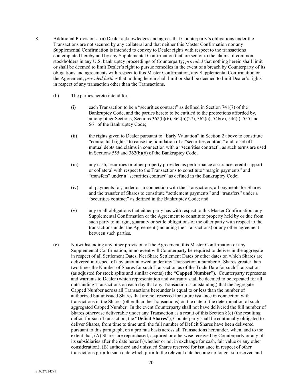 20 #100272242v5 8. Additional Provisions. (a) Dealer acknowledges and agrees that Counterparty’s obligations under the Transactions are not secured by any collateral and that neither this Master Confirmation nor any Supplemental Confirmation is intended to convey to Dealer rights with respect to the transactions contemplated hereby and by any Supplemental Confirmation that are senior to the claims of common stockholders in any U.S. bankruptcy proceedings of Counterparty; provided that nothing herein shall limit or shall be deemed to limit Dealer’s right to pursue remedies in the event of a breach by Counterparty of its obligations and agreements with respect to this Master Confirmation, any Supplemental Confirmation or the Agreement; provided further that nothing herein shall limit or shall be deemed to limit Dealer’s rights in respect of any transaction other than the Transactions. (b) The parties hereto intend for: (i) each Transaction to be a “securities contract” as defined in Section 741(7) of the Bankruptcy Code, and the parties hereto to be entitled to the protections afforded by, among other Sections, Sections 362(b)(6), 362(b)(27), 362(o), 546(e), 546(j), 555 and 561 of the Bankruptcy Code; (ii) the rights given to Dealer pursuant to “Early Valuation” in Section 2 above to constitute “contractual rights” to cause the liquidation of a “securities contract” and to set off mutual debts and claims in connection with a “securities contract”, as such terms are used in Sections 555 and 362(b)(6) of the Bankruptcy Code; (iii) any cash, securities or other property provided as performance assurance, credit support or collateral with respect to the Transactions to constitute “margin payments” and “transfers” under a “securities contract” as defined in the Bankruptcy Code; (iv) all payments for, under or in connection with the Transactions, all payments for Shares and the transfer of Shares to constitute “settlement payments” and “transfers” under a “securities contract” as defined in the Bankruptcy Code; and (v) any or all obligations that either party has with respect to this Master Confirmation, any Supplemental Confirmation or the Agreement to constitute property held by or due from such party to margin, guaranty or settle obligations of the other party with respect to the transactions under the Agreement (including the Transactions) or any other agreement between such parties. (c) Notwithstanding any other provision of the Agreement, this Master Confirmation or any Supplemental Confirmation, in no event will Counterparty be required to deliver in the aggregate in respect of all Settlement Dates, Net Share Settlement Dates or other dates on which Shares are delivered in respect of any amount owed under any Transaction a number of Shares greater than two times the Number of Shares for such Transaction as of the Trade Date for such Transaction (as adjusted for stock splits and similar events) (the “Capped Number”). Counterparty represents and warrants to Dealer (which representation and warranty shall be deemed to be repeated for all outstanding Transactions on each day that any Transaction is outstanding) that the aggregate Capped Number across all Transactions hereunder is equal to or less than the number of authorized but unissued Shares that are not reserved for future issuance in connection with transactions in the Shares (other than the Transactions) on the date of the determination of such aggregated Capped Number. In the event Counterparty shall not have delivered the full number of Shares otherwise deliverable under any Transaction as a result of this Section 8(c) (the resulting deficit for such Transaction, the “Deficit Shares”), Counterparty shall be continually obligated to deliver Shares, from time to time until the full number of Deficit Shares have been delivered pursuant to this paragraph, on a pro rata basis across all Transactions hereunder, when, and to the extent that, (A) Shares are repurchased, acquired or otherwise received by Counterparty or any of its subsidiaries after the date hereof (whether or not in exchange for cash, fair value or any other consideration), (B) authorized and unissued Shares reserved for issuance in respect of other transactions prior to such date which prior to the relevant date become no longer so reserved and
