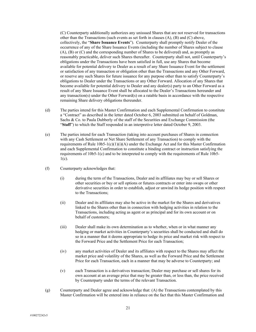 21 #100272242v5 (C) Counterparty additionally authorizes any unissued Shares that are not reserved for transactions other than the Transactions (such events as set forth in clauses (A), (B) and (C) above, collectively, the “Share Issuance Events”). Counterparty shall promptly notify Dealer of the occurrence of any of the Share Issuance Events (including the number of Shares subject to clause (A), (B) or (C) and the corresponding number of Shares to be delivered) and, as promptly as reasonably practicable, deliver such Shares thereafter. Counterparty shall not, until Counterparty’s obligations under the Transactions have been satisfied in full, use any Shares that become available for potential delivery to Dealer as a result of any Share Issuance Event for the settlement or satisfaction of any transaction or obligation other than the Transactions and any Other Forward, or reserve any such Shares for future issuance for any purpose other than to satisfy Counterparty’s obligations to Dealer under the Transactions or any Other Forward. Allocation of any Shares that become available for potential delivery to Dealer and any dealer(s) party to an Other Forward as a result of any Share Issuance Event shall be allocated to the Dealer’s Transactions hereunder and any transaction(s) under the Other Forward(s) on a ratable basis in accordance with the respective remaining Share delivery obligations thereunder. (d) The parties intend for this Master Confirmation and each Supplemental Confirmation to constitute a “Contract” as described in the letter dated October 6, 2003 submitted on behalf of Goldman, Sachs & Co. to Paula Dubberly of the staff of the Securities and Exchange Commission (the “Staff”) to which the Staff responded in an interpretive letter dated October 9, 2003. (e) The parties intend for each Transaction (taking into account purchases of Shares in connection with any Cash Settlement or Net Share Settlement of any Transaction) to comply with the requirements of Rule 10b5-1(c)(1)(i)(A) under the Exchange Act and for this Master Confirmation and each Supplemental Confirmation to constitute a binding contract or instruction satisfying the requirements of 10b5-1(c) and to be interpreted to comply with the requirements of Rule 10b5- 1(c). (f) Counterparty acknowledges that: (i) during the term of the Transactions, Dealer and its affiliates may buy or sell Shares or other securities or buy or sell options or futures contracts or enter into swaps or other derivative securities in order to establish, adjust or unwind its hedge position with respect to the Transactions; (ii) Dealer and its affiliates may also be active in the market for the Shares and derivatives linked to the Shares other than in connection with hedging activities in relation to the Transactions, including acting as agent or as principal and for its own account or on behalf of customers; (iii) Dealer shall make its own determination as to whether, when or in what manner any hedging or market activities in Counterparty’s securities shall be conducted and shall do so in a manner that it deems appropriate to hedge its price and market risk with respect to the Forward Price and the Settlement Price for each Transaction; (iv) any market activities of Dealer and its affiliates with respect to the Shares may affect the market price and volatility of the Shares, as well as the Forward Price and the Settlement Price for each Transaction, each in a manner that may be adverse to Counterparty; and (v) each Transaction is a derivatives transaction; Dealer may purchase or sell shares for its own account at an average price that may be greater than, or less than, the price received by Counterparty under the terms of the relevant Transaction. (g) Counterparty and Dealer agree and acknowledge that: (A) the Transactions contemplated by this Master Confirmation will be entered into in reliance on the fact that this Master Confirmation and