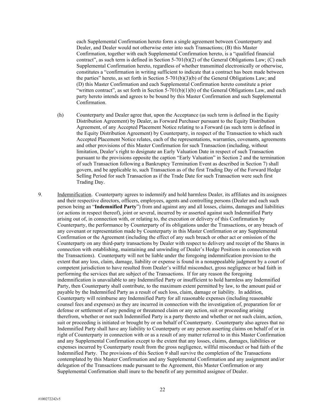 22 #100272242v5 each Supplemental Confirmation hereto form a single agreement between Counterparty and Dealer, and Dealer would not otherwise enter into such Transactions; (B) this Master Confirmation, together with each Supplemental Confirmation hereto, is a “qualified financial contract”, as such term is defined in Section 5-701(b)(2) of the General Obligations Law; (C) each Supplemental Confirmation hereto, regardless of whether transmitted electronically or otherwise, constitutes a “confirmation in writing sufficient to indicate that a contract has been made between the parties” hereto, as set forth in Section 5-701(b)(3)(b) of the General Obligations Law; and (D) this Master Confirmation and each Supplemental Confirmation hereto constitute a prior “written contract”, as set forth in Section 5-701(b)(1)(b) of the General Obligations Law, and each party hereto intends and agrees to be bound by this Master Confirmation and such Supplemental Confirmation. (h) Counterparty and Dealer agree that, upon the Acceptance (as such term is defined in the Equity Distribution Agreement) by Dealer, as Forward Purchaser pursuant to the Equity Distribution Agreement, of any Accepted Placement Notice relating to a Forward (as such term is defined in the Equity Distribution Agreement) by Counterparty, in respect of the Transaction to which such Accepted Placement Notice relates, each of the representations, warranties, covenants, agreements and other provisions of this Master Confirmation for such Transaction (including, without limitation, Dealer’s right to designate an Early Valuation Date in respect of such Transaction pursuant to the provisions opposite the caption “Early Valuation” in Section 2 and the termination of such Transaction following a Bankruptcy Termination Event as described in Section 7) shall govern, and be applicable to, such Transaction as of the first Trading Day of the Forward Hedge Selling Period for such Transaction as if the Trade Date for such Transaction were such first Trading Day. 9. Indemnification. Counterparty agrees to indemnify and hold harmless Dealer, its affiliates and its assignees and their respective directors, officers, employees, agents and controlling persons (Dealer and each such person being an “Indemnified Party”) from and against any and all losses, claims, damages and liabilities (or actions in respect thereof), joint or several, incurred by or asserted against such Indemnified Party arising out of, in connection with, or relating to, the execution or delivery of this Confirmation by Counterparty, the performance by Counterparty of its obligations under the Transactions, or any breach of any covenant or representation made by Counterparty in this Master Confirmation or any Supplemental Confirmation or the Agreement (including the effect of any such breach or other act or omission of the Counterparty on any third-party transactions by Dealer with respect to delivery and receipt of the Shares in connection with establishing, maintaining and unwinding of Dealer’s Hedge Positions in connection with the Transactions). Counterparty will not be liable under the foregoing indemnification provision to the extent that any loss, claim, damage, liability or expense is found in a nonappealable judgment by a court of competent jurisdiction to have resulted from Dealer’s willful misconduct, gross negligence or bad faith in performing the services that are subject of the Transactions. If for any reason the foregoing indemnification is unavailable to any Indemnified Party or insufficient to hold harmless any Indemnified Party, then Counterparty shall contribute, to the maximum extent permitted by law, to the amount paid or payable by the Indemnified Party as a result of such loss, claim, damage or liability. In addition, Counterparty will reimburse any Indemnified Party for all reasonable expenses (including reasonable counsel fees and expenses) as they are incurred in connection with the investigation of, preparation for or defense or settlement of any pending or threatened claim or any action, suit or proceeding arising therefrom, whether or not such Indemnified Party is a party thereto and whether or not such claim, action, suit or proceeding is initiated or brought by or on behalf of Counterparty. Counterparty also agrees that no Indemnified Party shall have any liability to Counterparty or any person asserting claims on behalf of or in right of Counterparty in connection with or as a result of any matter referred to in this Master Confirmation and any Supplemental Confirmation except to the extent that any losses, claims, damages, liabilities or expenses incurred by Counterparty result from the gross negligence, willful misconduct or bad faith of the Indemnified Party. The provisions of this Section 9 shall survive the completion of the Transactions contemplated by this Master Confirmation and any Supplemental Confirmation and any assignment and/or delegation of the Transactions made pursuant to the Agreement, this Master Confirmation or any Supplemental Confirmation shall inure to the benefit of any permitted assignee of Dealer.