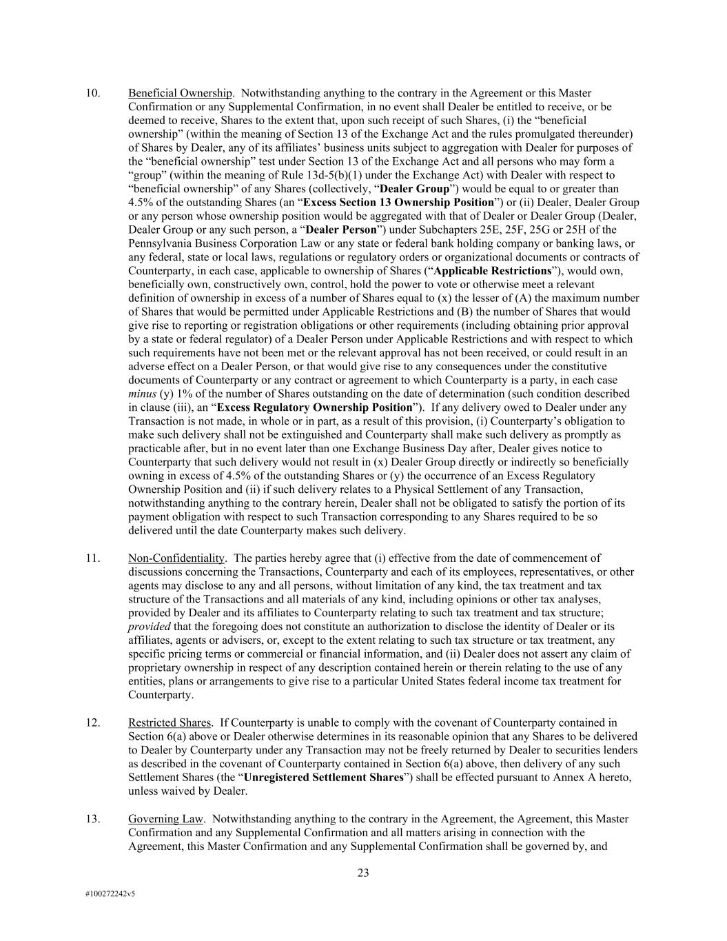 23 #100272242v5 10. Beneficial Ownership. Notwithstanding anything to the contrary in the Agreement or this Master Confirmation or any Supplemental Confirmation, in no event shall Dealer be entitled to receive, or be deemed to receive, Shares to the extent that, upon such receipt of such Shares, (i) the “beneficial ownership” (within the meaning of Section 13 of the Exchange Act and the rules promulgated thereunder) of Shares by Dealer, any of its affiliates’ business units subject to aggregation with Dealer for purposes of the “beneficial ownership” test under Section 13 of the Exchange Act and all persons who may form a “group” (within the meaning of Rule 13d-5(b)(1) under the Exchange Act) with Dealer with respect to “beneficial ownership” of any Shares (collectively, “Dealer Group”) would be equal to or greater than 4.5% of the outstanding Shares (an “Excess Section 13 Ownership Position”) or (ii) Dealer, Dealer Group or any person whose ownership position would be aggregated with that of Dealer or Dealer Group (Dealer, Dealer Group or any such person, a “Dealer Person”) under Subchapters 25E, 25F, 25G or 25H of the Pennsylvania Business Corporation Law or any state or federal bank holding company or banking laws, or any federal, state or local laws, regulations or regulatory orders or organizational documents or contracts of Counterparty, in each case, applicable to ownership of Shares (“Applicable Restrictions”), would own, beneficially own, constructively own, control, hold the power to vote or otherwise meet a relevant definition of ownership in excess of a number of Shares equal to (x) the lesser of (A) the maximum number of Shares that would be permitted under Applicable Restrictions and (B) the number of Shares that would give rise to reporting or registration obligations or other requirements (including obtaining prior approval by a state or federal regulator) of a Dealer Person under Applicable Restrictions and with respect to which such requirements have not been met or the relevant approval has not been received, or could result in an adverse effect on a Dealer Person, or that would give rise to any consequences under the constitutive documents of Counterparty or any contract or agreement to which Counterparty is a party, in each case minus (y) 1% of the number of Shares outstanding on the date of determination (such condition described in clause (iii), an “Excess Regulatory Ownership Position”). If any delivery owed to Dealer under any Transaction is not made, in whole or in part, as a result of this provision, (i) Counterparty’s obligation to make such delivery shall not be extinguished and Counterparty shall make such delivery as promptly as practicable after, but in no event later than one Exchange Business Day after, Dealer gives notice to Counterparty that such delivery would not result in (x) Dealer Group directly or indirectly so beneficially owning in excess of 4.5% of the outstanding Shares or (y) the occurrence of an Excess Regulatory Ownership Position and (ii) if such delivery relates to a Physical Settlement of any Transaction, notwithstanding anything to the contrary herein, Dealer shall not be obligated to satisfy the portion of its payment obligation with respect to such Transaction corresponding to any Shares required to be so delivered until the date Counterparty makes such delivery. 11. Non-Confidentiality. The parties hereby agree that (i) effective from the date of commencement of discussions concerning the Transactions, Counterparty and each of its employees, representatives, or other agents may disclose to any and all persons, without limitation of any kind, the tax treatment and tax structure of the Transactions and all materials of any kind, including opinions or other tax analyses, provided by Dealer and its affiliates to Counterparty relating to such tax treatment and tax structure; provided that the foregoing does not constitute an authorization to disclose the identity of Dealer or its affiliates, agents or advisers, or, except to the extent relating to such tax structure or tax treatment, any specific pricing terms or commercial or financial information, and (ii) Dealer does not assert any claim of proprietary ownership in respect of any description contained herein or therein relating to the use of any entities, plans or arrangements to give rise to a particular United States federal income tax treatment for Counterparty. 12. Restricted Shares. If Counterparty is unable to comply with the covenant of Counterparty contained in Section 6(a) above or Dealer otherwise determines in its reasonable opinion that any Shares to be delivered to Dealer by Counterparty under any Transaction may not be freely returned by Dealer to securities lenders as described in the covenant of Counterparty contained in Section 6(a) above, then delivery of any such Settlement Shares (the “Unregistered Settlement Shares”) shall be effected pursuant to Annex A hereto, unless waived by Dealer. 13. Governing Law. Notwithstanding anything to the contrary in the Agreement, the Agreement, this Master Confirmation and any Supplemental Confirmation and all matters arising in connection with the Agreement, this Master Confirmation and any Supplemental Confirmation shall be governed by, and