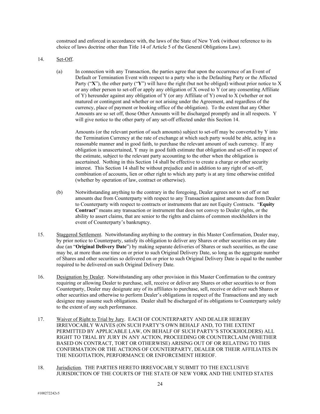24 #100272242v5 construed and enforced in accordance with, the laws of the State of New York (without reference to its choice of laws doctrine other than Title 14 of Article 5 of the General Obligations Law). 14. Set-Off. (a) In connection with any Transaction, the parties agree that upon the occurrence of an Event of Default or Termination Event with respect to a party who is the Defaulting Party or the Affected Party (“X”), the other party (“Y”) will have the right (but not be obliged) without prior notice to X or any other person to set-off or apply any obligation of X owed to Y (or any consenting Affiliate of Y) hereunder against any obligation of Y (or any Affiliate of Y) owed to X (whether or not matured or contingent and whether or not arising under the Agreement, and regardless of the currency, place of payment or booking office of the obligation). To the extent that any Other Amounts are so set off, those Other Amounts will be discharged promptly and in all respects. Y will give notice to the other party of any set-off effected under this Section 14. Amounts (or the relevant portion of such amounts) subject to set-off may be converted by Y into the Termination Currency at the rate of exchange at which such party would be able, acting in a reasonable manner and in good faith, to purchase the relevant amount of such currency. If any obligation is unascertained, Y may in good faith estimate that obligation and set-off in respect of the estimate, subject to the relevant party accounting to the other when the obligation is ascertained. Nothing in this Section 14 shall be effective to create a charge or other security interest. This Section 14 shall be without prejudice and in addition to any right of set-off, combination of accounts, lien or other right to which any party is at any time otherwise entitled (whether by operation of law, contract or otherwise). (b) Notwithstanding anything to the contrary in the foregoing, Dealer agrees not to set off or net amounts due from Counterparty with respect to any Transaction against amounts due from Dealer to Counterparty with respect to contracts or instruments that are not Equity Contracts. “Equity Contract” means any transaction or instrument that does not convey to Dealer rights, or the ability to assert claims, that are senior to the rights and claims of common stockholders in the event of Counterparty’s bankruptcy. 15. Staggered Settlement. Notwithstanding anything to the contrary in this Master Confirmation, Dealer may, by prior notice to Counterparty, satisfy its obligation to deliver any Shares or other securities on any date due (an “Original Delivery Date”) by making separate deliveries of Shares or such securities, as the case may be, at more than one time on or prior to such Original Delivery Date, so long as the aggregate number of Shares and other securities so delivered on or prior to such Original Delivery Date is equal to the number required to be delivered on such Original Delivery Date. 16. Designation by Dealer. Notwithstanding any other provision in this Master Confirmation to the contrary requiring or allowing Dealer to purchase, sell, receive or deliver any Shares or other securities to or from Counterparty, Dealer may designate any of its affiliates to purchase, sell, receive or deliver such Shares or other securities and otherwise to perform Dealer’s obligations in respect of the Transactions and any such designee may assume such obligations. Dealer shall be discharged of its obligations to Counterparty solely to the extent of any such performance. 17. Waiver of Right to Trial by Jury. EACH OF COUNTERPARTY AND DEALER HEREBY IRREVOCABLY WAIVES (ON SUCH PARTY’S OWN BEHALF AND, TO THE EXTENT PERMITTED BY APPLICABLE LAW, ON BEHALF OF SUCH PARTY’S STOCKHOLDERS) ALL RIGHT TO TRIAL BY JURY IN ANY ACTION, PROCEEDING OR COUNTERCLAIM (WHETHER BASED ON CONTRACT, TORT OR OTHERWISE) ARISING OUT OF OR RELATING TO THIS CONFIRMATION OR THE ACTIONS OF COUNTERPARTY, DEALER OR THEIR AFFILIATES IN THE NEGOTIATION, PERFORMANCE OR ENFORCEMENT HEREOF. 18. Jurisdiction. THE PARTIES HERETO IRREVOCABLY SUBMIT TO THE EXCLUSIVE JURISDICTION OF THE COURTS OF THE STATE OF NEW YORK AND THE UNITED STATES