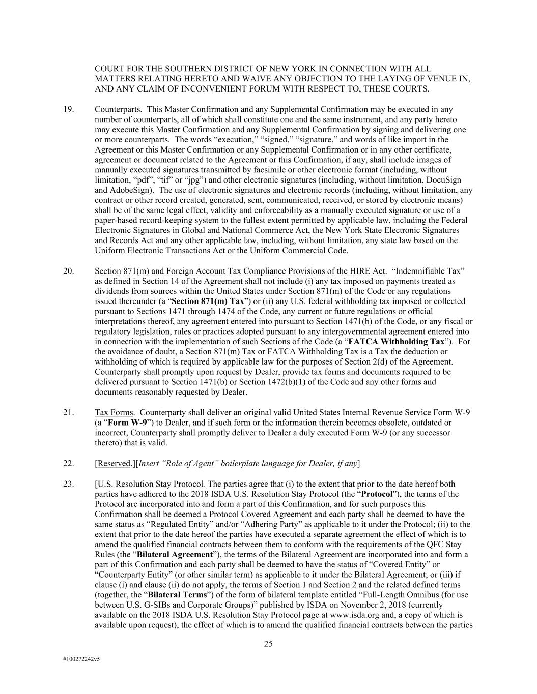 25 #100272242v5 COURT FOR THE SOUTHERN DISTRICT OF NEW YORK IN CONNECTION WITH ALL MATTERS RELATING HERETO AND WAIVE ANY OBJECTION TO THE LAYING OF VENUE IN, AND ANY CLAIM OF INCONVENIENT FORUM WITH RESPECT TO, THESE COURTS. 19. Counterparts. This Master Confirmation and any Supplemental Confirmation may be executed in any number of counterparts, all of which shall constitute one and the same instrument, and any party hereto may execute this Master Confirmation and any Supplemental Confirmation by signing and delivering one or more counterparts. The words “execution,” “signed,” “signature,” and words of like import in the Agreement or this Master Confirmation or any Supplemental Confirmation or in any other certificate, agreement or document related to the Agreement or this Confirmation, if any, shall include images of manually executed signatures transmitted by facsimile or other electronic format (including, without limitation, “pdf”, “tif” or “jpg”) and other electronic signatures (including, without limitation, DocuSign and AdobeSign). The use of electronic signatures and electronic records (including, without limitation, any contract or other record created, generated, sent, communicated, received, or stored by electronic means) shall be of the same legal effect, validity and enforceability as a manually executed signature or use of a paper-based record-keeping system to the fullest extent permitted by applicable law, including the Federal Electronic Signatures in Global and National Commerce Act, the New York State Electronic Signatures and Records Act and any other applicable law, including, without limitation, any state law based on the Uniform Electronic Transactions Act or the Uniform Commercial Code. 20. Section 871(m) and Foreign Account Tax Compliance Provisions of the HIRE Act. “Indemnifiable Tax” as defined in Section 14 of the Agreement shall not include (i) any tax imposed on payments treated as dividends from sources within the United States under Section 871(m) of the Code or any regulations issued thereunder (a “Section 871(m) Tax”) or (ii) any U.S. federal withholding tax imposed or collected pursuant to Sections 1471 through 1474 of the Code, any current or future regulations or official interpretations thereof, any agreement entered into pursuant to Section 1471(b) of the Code, or any fiscal or regulatory legislation, rules or practices adopted pursuant to any intergovernmental agreement entered into in connection with the implementation of such Sections of the Code (a “FATCA Withholding Tax”). For the avoidance of doubt, a Section 871(m) Tax or FATCA Withholding Tax is a Tax the deduction or withholding of which is required by applicable law for the purposes of Section 2(d) of the Agreement. Counterparty shall promptly upon request by Dealer, provide tax forms and documents required to be delivered pursuant to Section 1471(b) or Section 1472(b)(1) of the Code and any other forms and documents reasonably requested by Dealer. 21. Tax Forms. Counterparty shall deliver an original valid United States Internal Revenue Service Form W-9 (a “Form W-9”) to Dealer, and if such form or the information therein becomes obsolete, outdated or incorrect, Counterparty shall promptly deliver to Dealer a duly executed Form W-9 (or any successor thereto) that is valid. 22. [Reserved.][Insert “Role of Agent” boilerplate language for Dealer, if any] 23. [U.S. Resolution Stay Protocol. The parties agree that (i) to the extent that prior to the date hereof both parties have adhered to the 2018 ISDA U.S. Resolution Stay Protocol (the “Protocol”), the terms of the Protocol are incorporated into and form a part of this Confirmation, and for such purposes this Confirmation shall be deemed a Protocol Covered Agreement and each party shall be deemed to have the same status as “Regulated Entity” and/or “Adhering Party” as applicable to it under the Protocol; (ii) to the extent that prior to the date hereof the parties have executed a separate agreement the effect of which is to amend the qualified financial contracts between them to conform with the requirements of the QFC Stay Rules (the “Bilateral Agreement”), the terms of the Bilateral Agreement are incorporated into and form a part of this Confirmation and each party shall be deemed to have the status of “Covered Entity” or “Counterparty Entity” (or other similar term) as applicable to it under the Bilateral Agreement; or (iii) if clause (i) and clause (ii) do not apply, the terms of Section 1 and Section 2 and the related defined terms (together, the “Bilateral Terms”) of the form of bilateral template entitled “Full-Length Omnibus (for use between U.S. G-SIBs and Corporate Groups)” published by ISDA on November 2, 2018 (currently available on the 2018 ISDA U.S. Resolution Stay Protocol page at www.isda.org and, a copy of which is available upon request), the effect of which is to amend the qualified financial contracts between the parties