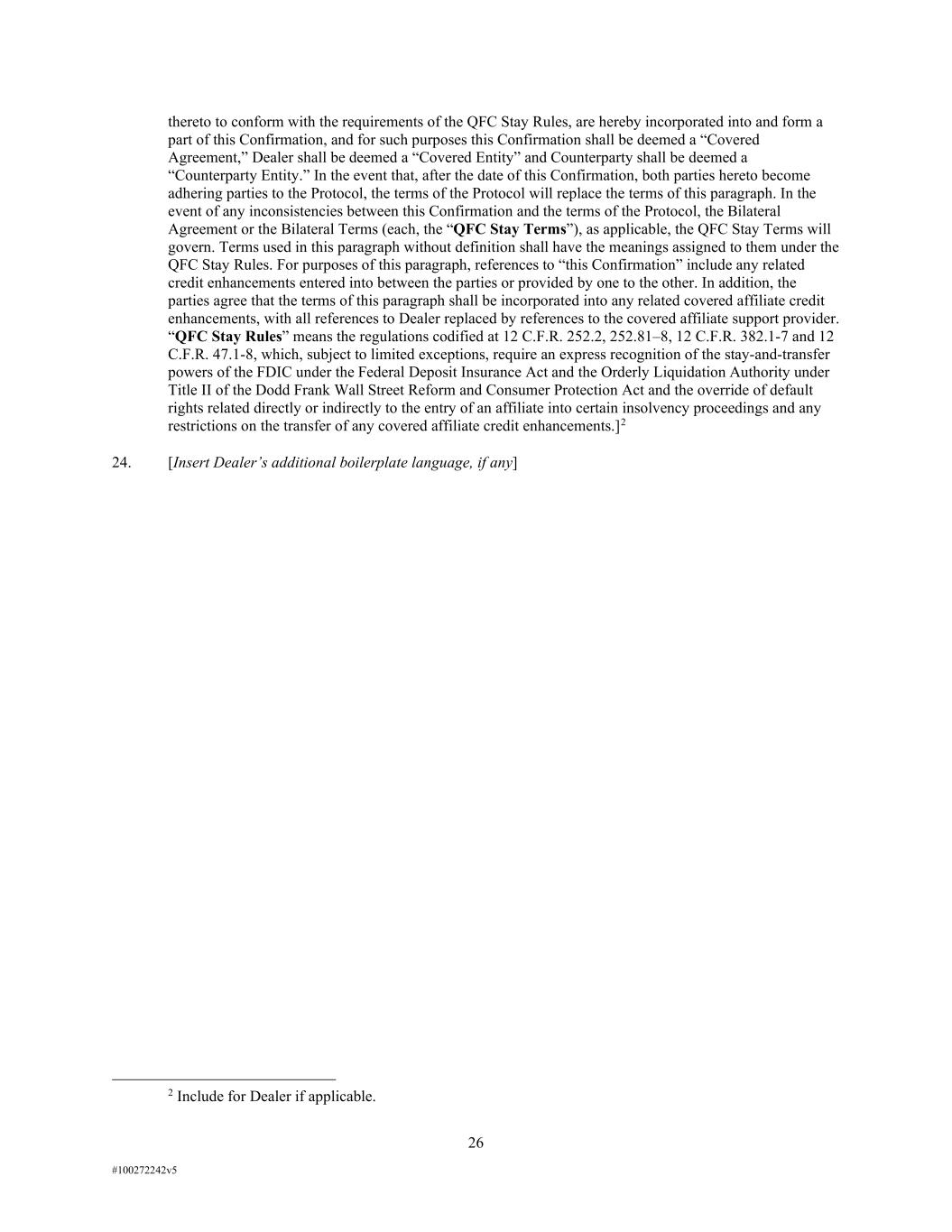 26 #100272242v5 thereto to conform with the requirements of the QFC Stay Rules, are hereby incorporated into and form a part of this Confirmation, and for such purposes this Confirmation shall be deemed a “Covered Agreement,” Dealer shall be deemed a “Covered Entity” and Counterparty shall be deemed a “Counterparty Entity.” In the event that, after the date of this Confirmation, both parties hereto become adhering parties to the Protocol, the terms of the Protocol will replace the terms of this paragraph. In the event of any inconsistencies between this Confirmation and the terms of the Protocol, the Bilateral Agreement or the Bilateral Terms (each, the “QFC Stay Terms”), as applicable, the QFC Stay Terms will govern. Terms used in this paragraph without definition shall have the meanings assigned to them under the QFC Stay Rules. For purposes of this paragraph, references to “this Confirmation” include any related credit enhancements entered into between the parties or provided by one to the other. In addition, the parties agree that the terms of this paragraph shall be incorporated into any related covered affiliate credit enhancements, with all references to Dealer replaced by references to the covered affiliate support provider. “QFC Stay Rules” means the regulations codified at 12 C.F.R. 252.2, 252.81–8, 12 C.F.R. 382.1-7 and 12 C.F.R. 47.1-8, which, subject to limited exceptions, require an express recognition of the stay-and-transfer powers of the FDIC under the Federal Deposit Insurance Act and the Orderly Liquidation Authority under Title II of the Dodd Frank Wall Street Reform and Consumer Protection Act and the override of default rights related directly or indirectly to the entry of an affiliate into certain insolvency proceedings and any restrictions on the transfer of any covered affiliate credit enhancements.]2 24. [Insert Dealer’s additional boilerplate language, if any] 2 Include for Dealer if applicable.
