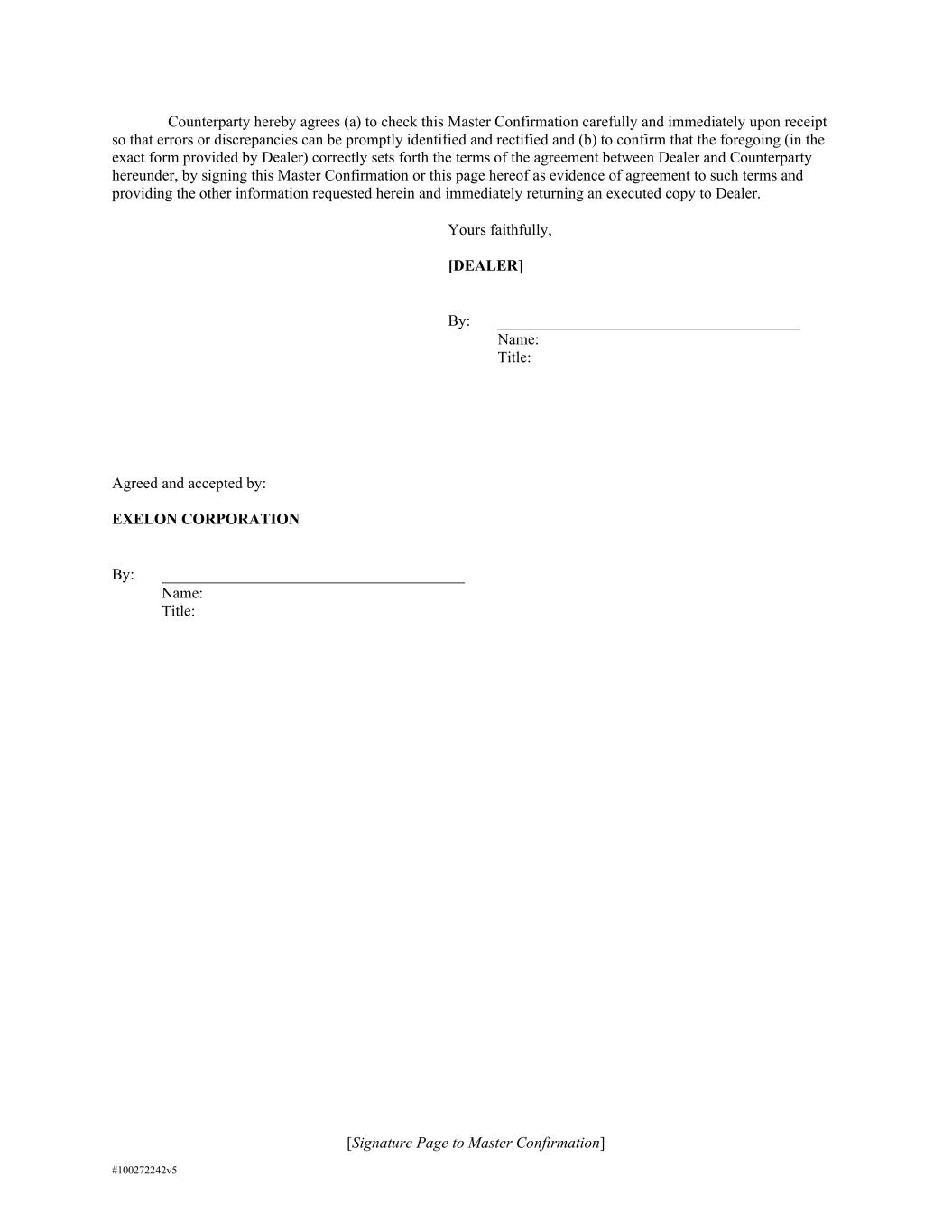 [Signature Page to Master Confirmation] #100272242v5 Counterparty hereby agrees (a) to check this Master Confirmation carefully and immediately upon receipt so that errors or discrepancies can be promptly identified and rectified and (b) to confirm that the foregoing (in the exact form provided by Dealer) correctly sets forth the terms of the agreement between Dealer and Counterparty hereunder, by signing this Master Confirmation or this page hereof as evidence of agreement to such terms and providing the other information requested herein and immediately returning an executed copy to Dealer. Yours faithfully, [DEALER] By: Name: Title: Agreed and accepted by: EXELON CORPORATION By: Name: Title: