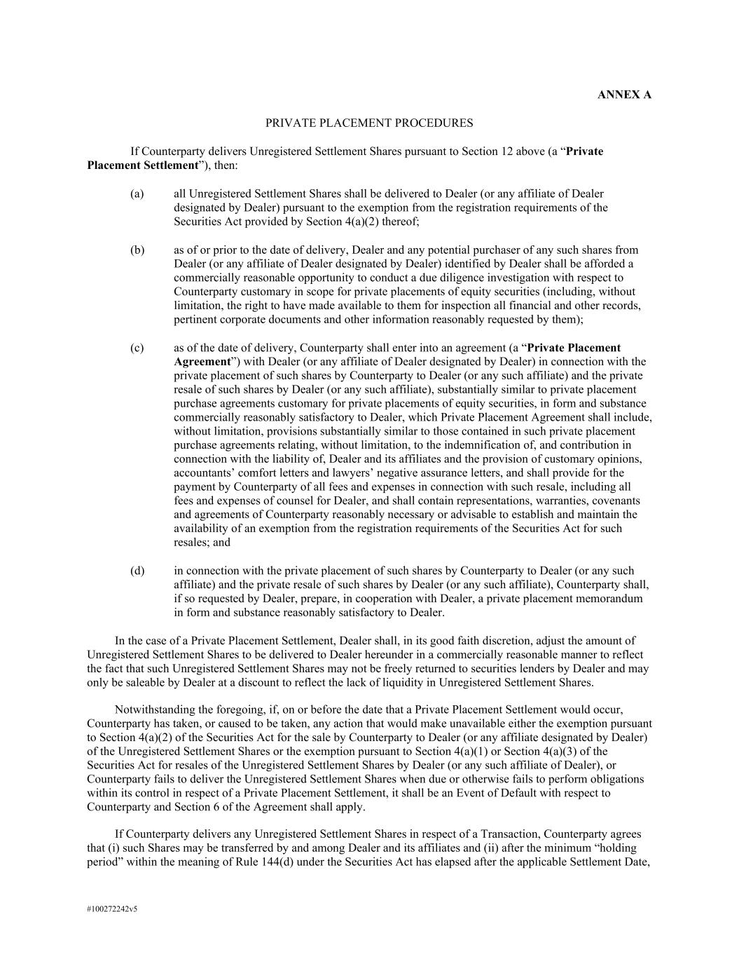 #100272242v5 ANNEX A PRIVATE PLACEMENT PROCEDURES If Counterparty delivers Unregistered Settlement Shares pursuant to Section 12 above (a “Private Placement Settlement”), then: (a) all Unregistered Settlement Shares shall be delivered to Dealer (or any affiliate of Dealer designated by Dealer) pursuant to the exemption from the registration requirements of the Securities Act provided by Section 4(a)(2) thereof; (b) as of or prior to the date of delivery, Dealer and any potential purchaser of any such shares from Dealer (or any affiliate of Dealer designated by Dealer) identified by Dealer shall be afforded a commercially reasonable opportunity to conduct a due diligence investigation with respect to Counterparty customary in scope for private placements of equity securities (including, without limitation, the right to have made available to them for inspection all financial and other records, pertinent corporate documents and other information reasonably requested by them); (c) as of the date of delivery, Counterparty shall enter into an agreement (a “Private Placement Agreement”) with Dealer (or any affiliate of Dealer designated by Dealer) in connection with the private placement of such shares by Counterparty to Dealer (or any such affiliate) and the private resale of such shares by Dealer (or any such affiliate), substantially similar to private placement purchase agreements customary for private placements of equity securities, in form and substance commercially reasonably satisfactory to Dealer, which Private Placement Agreement shall include, without limitation, provisions substantially similar to those contained in such private placement purchase agreements relating, without limitation, to the indemnification of, and contribution in connection with the liability of, Dealer and its affiliates and the provision of customary opinions, accountants’ comfort letters and lawyers’ negative assurance letters, and shall provide for the payment by Counterparty of all fees and expenses in connection with such resale, including all fees and expenses of counsel for Dealer, and shall contain representations, warranties, covenants and agreements of Counterparty reasonably necessary or advisable to establish and maintain the availability of an exemption from the registration requirements of the Securities Act for such resales; and (d) in connection with the private placement of such shares by Counterparty to Dealer (or any such affiliate) and the private resale of such shares by Dealer (or any such affiliate), Counterparty shall, if so requested by Dealer, prepare, in cooperation with Dealer, a private placement memorandum in form and substance reasonably satisfactory to Dealer. In the case of a Private Placement Settlement, Dealer shall, in its good faith discretion, adjust the amount of Unregistered Settlement Shares to be delivered to Dealer hereunder in a commercially reasonable manner to reflect the fact that such Unregistered Settlement Shares may not be freely returned to securities lenders by Dealer and may only be saleable by Dealer at a discount to reflect the lack of liquidity in Unregistered Settlement Shares. Notwithstanding the foregoing, if, on or before the date that a Private Placement Settlement would occur, Counterparty has taken, or caused to be taken, any action that would make unavailable either the exemption pursuant to Section 4(a)(2) of the Securities Act for the sale by Counterparty to Dealer (or any affiliate designated by Dealer) of the Unregistered Settlement Shares or the exemption pursuant to Section 4(a)(1) or Section 4(a)(3) of the Securities Act for resales of the Unregistered Settlement Shares by Dealer (or any such affiliate of Dealer), or Counterparty fails to deliver the Unregistered Settlement Shares when due or otherwise fails to perform obligations within its control in respect of a Private Placement Settlement, it shall be an Event of Default with respect to Counterparty and Section 6 of the Agreement shall apply. If Counterparty delivers any Unregistered Settlement Shares in respect of a Transaction, Counterparty agrees that (i) such Shares may be transferred by and among Dealer and its affiliates and (ii) after the minimum “holding period” within the meaning of Rule 144(d) under the Securities Act has elapsed after the applicable Settlement Date,
