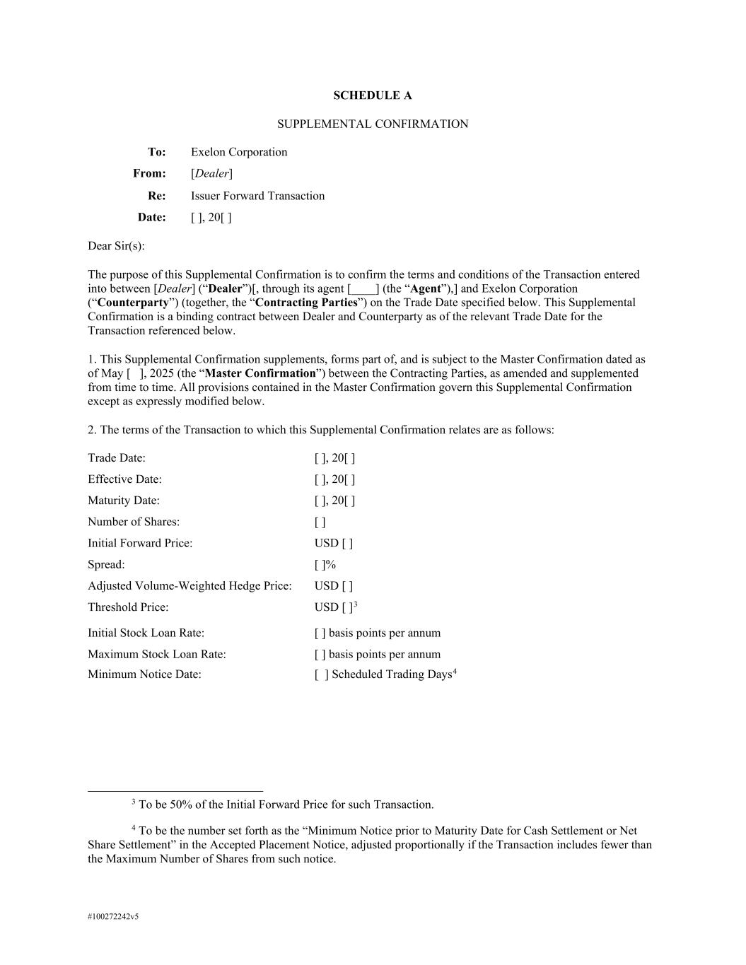#100272242v5 SCHEDULE A SUPPLEMENTAL CONFIRMATION To: Exelon Corporation From: [Dealer] Re: Issuer Forward Transaction Date: [ ], 20[ ] Dear Sir(s): The purpose of this Supplemental Confirmation is to confirm the terms and conditions of the Transaction entered into between [Dealer] (“Dealer”)[, through its agent [____] (the “Agent”),] and Exelon Corporation (“Counterparty”) (together, the “Contracting Parties”) on the Trade Date specified below. This Supplemental Confirmation is a binding contract between Dealer and Counterparty as of the relevant Trade Date for the Transaction referenced below. 1. This Supplemental Confirmation supplements, forms part of, and is subject to the Master Confirmation dated as of May [ ], 2025 (the “Master Confirmation”) between the Contracting Parties, as amended and supplemented from time to time. All provisions contained in the Master Confirmation govern this Supplemental Confirmation except as expressly modified below. 2. The terms of the Transaction to which this Supplemental Confirmation relates are as follows: Trade Date: [ ], 20[ ] Effective Date: [ ], 20[ ] Maturity Date: [ ], 20[ ] Number of Shares: [ ] Initial Forward Price: USD [ ] Spread: [ ]% Adjusted Volume-Weighted Hedge Price: USD [ ] Threshold Price: USD [ ]3 Initial Stock Loan Rate: [ ] basis points per annum Maximum Stock Loan Rate: [ ] basis points per annum Minimum Notice Date: [ ] Scheduled Trading Days4 3 To be 50% of the Initial Forward Price for such Transaction. 4 To be the number set forth as the “Minimum Notice prior to Maturity Date for Cash Settlement or Net Share Settlement” in the Accepted Placement Notice, adjusted proportionally if the Transaction includes fewer than the Maximum Number of Shares from such notice.