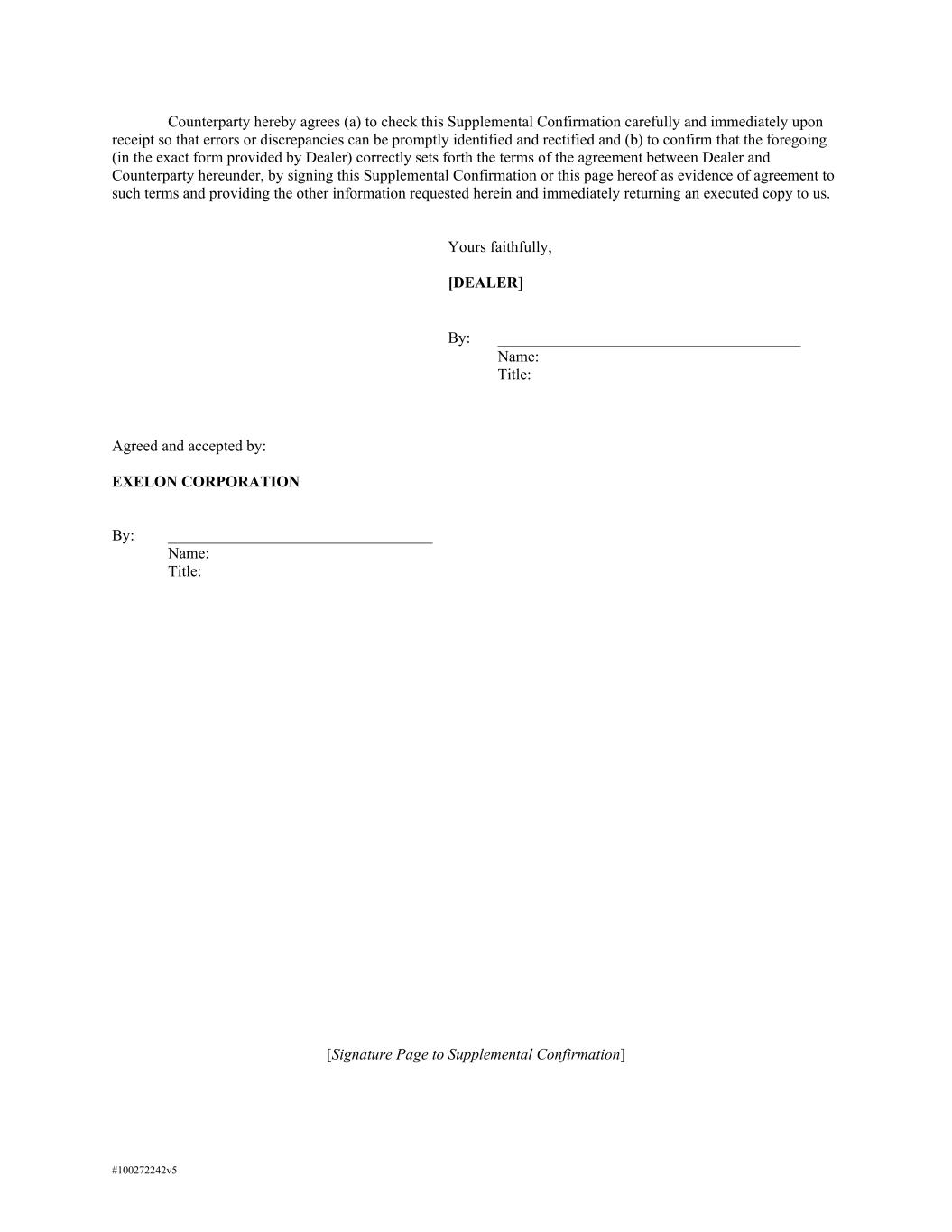 #100272242v5 Counterparty hereby agrees (a) to check this Supplemental Confirmation carefully and immediately upon receipt so that errors or discrepancies can be promptly identified and rectified and (b) to confirm that the foregoing (in the exact form provided by Dealer) correctly sets forth the terms of the agreement between Dealer and Counterparty hereunder, by signing this Supplemental Confirmation or this page hereof as evidence of agreement to such terms and providing the other information requested herein and immediately returning an executed copy to us. Yours faithfully, [DEALER] By: Name: Title: Agreed and accepted by: EXELON CORPORATION By: __________________________________ Name: Title: [Signature Page to Supplemental Confirmation]