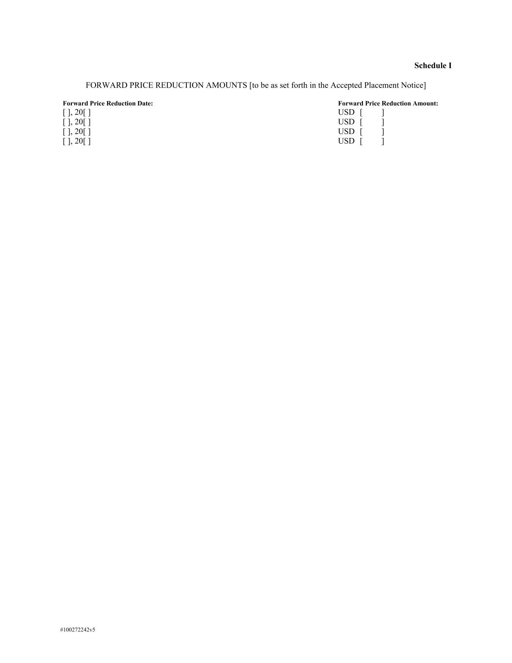 #100272242v5 Schedule I FORWARD PRICE REDUCTION AMOUNTS [to be as set forth in the Accepted Placement Notice] Forward Price Reduction Date: Forward Price Reduction Amount: [ ], 20[ ] USD [ ] [ ], 20[ ] USD [ ] [ ], 20[ ] USD [ ] [ ], 20[ ] USD [ ]