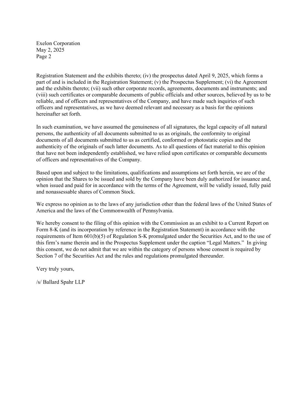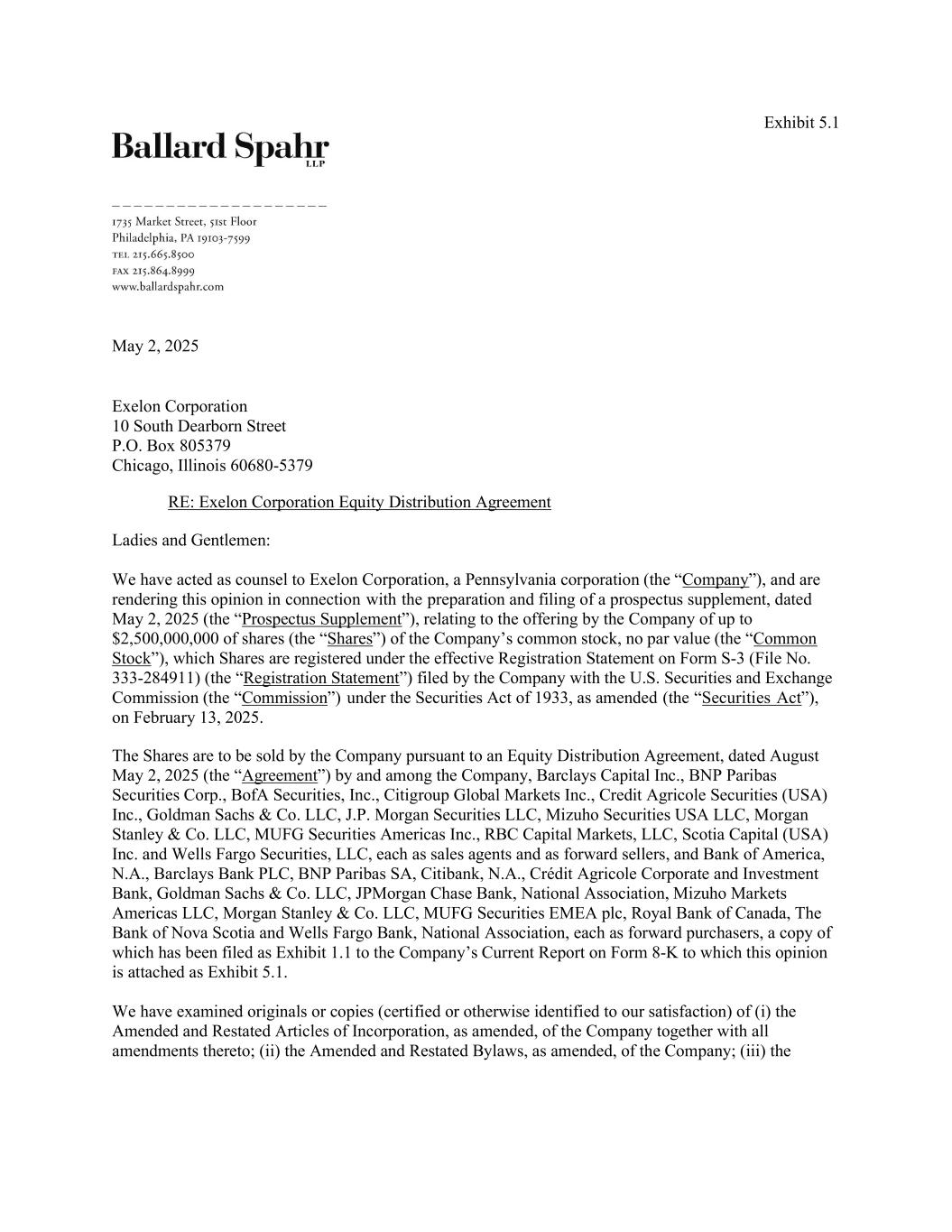 Execution Version EXELON CORPORATION UP TO $2.5 BILLION OF COMMON STOCK EQUITY DISTRIBUTION AGREEMENT May 2, 2025 BARCLAYS CAPITAL INC. 745 Seventh Avenue New York, New York 10019 BNP PARIBAS SECURITIES CORP. 787 Seventh Avenue New York, New York 10019 BOFA SECURITIES, INC. One Bryant Park New York, New York 10036 CITIGROUP GLOBAL MARKETS INC. 388 Greenwich Street New York, New York 10013 CREDIT AGRICOLE SECURITIES (USA) INC. 1301 Avenue of the Americas New York, NY 10019 GOLDMAN SACHS & CO. LLC 200 West Street New York, New York 10282 J.P. MORGAN SECURITIES LLC 383 Madison Avenue New York, New York 10179 MIZUHO SECURITIES USA LLC 1271 Avenue of the Americas New York, New York 10020 MORGAN STANLEY & CO. LLC 1585 Broadway New York, New York 10036 MUFG SECURITIES AMERICAS INC. 1221 Avenue of the Americas New York, New York 10020