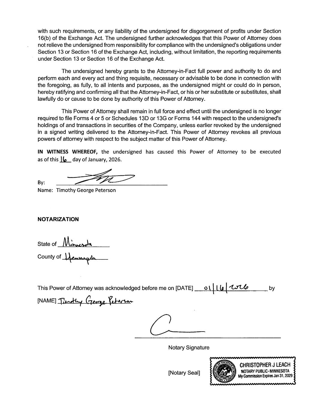| David T Skinner, attorney-in-fact for Timothy George Peterson | 02/04/2026 | |
